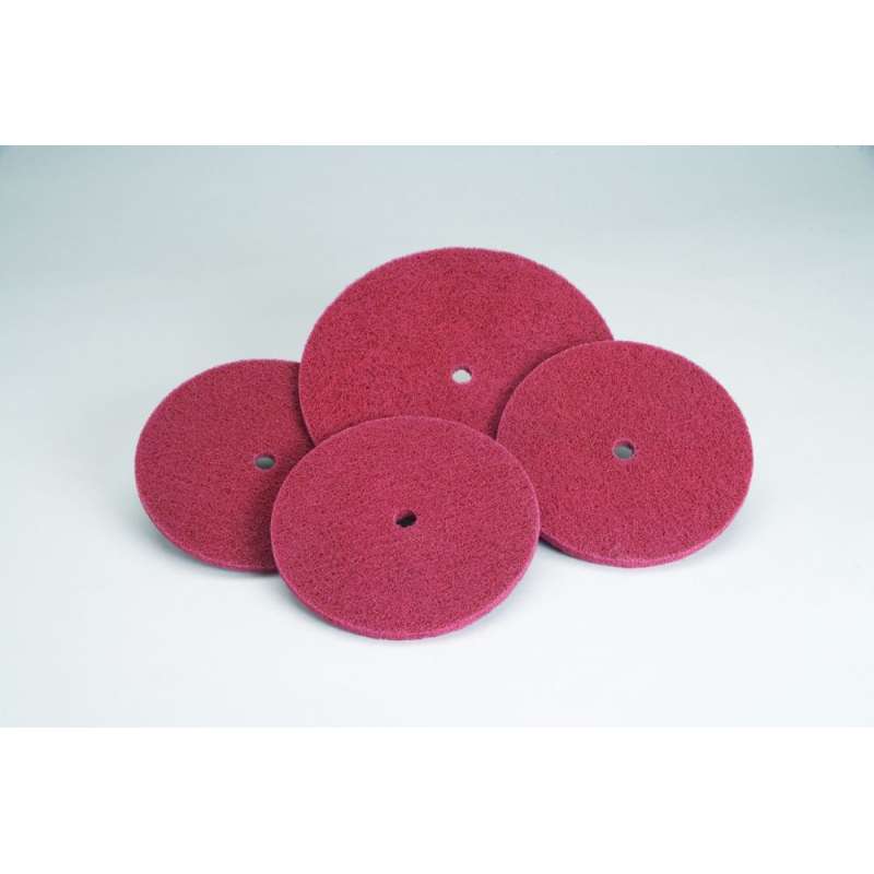 Made of non-woven material with added stiffness, the Standard Abrasives™ Buff and Blend HP Disc produces an aggressive cut and is designed for applications such as removal of burrs or tough contaminants. Added Stiffness for Lightweight Deburring and other Moderate Applications The Standard Abrasives™ Buff and Blend HP Disc efficiently performs light deburring and aggressive cleaning on a variety of metal substrates: ferrous and non-ferrous metals, aluminum, high nickel and stainless steel. The tough nylon web offers sustained performance and leaves a consistent finish on the workpiece, resulting in little to no rework. The very fine (VFN) grade abrasive contributes to a nice clean finish. This disc features aluminum oxide mineral, which cuts sharp and is friable, fragmenting under heat and pressure to reveal sharp cutting edges during use. Among the four Standard Abrasives™ Buff and Blend materials, HP material is moderately stiff, durable and aggressive, making it a good starting point for deburring applications. Its non-woven construction responds to contours and extrusions while minimizing gouging or marring of the part. If desired, discs may be ganged on a shaft to form a wheel. Durable Disc Accommodates Edges and Extrusions The HP Disc is a smart choice when you need to remove part lines from small castings, small burrs from threaded pipes, burrs from aluminum extrusions or die cast flashing, or heavy surface oxidation. Its durability results in a long service life, helping to reduce the need for replacements. Moreover, the sturdy material stands up to edges and extrusions, minimizing edge fraying and grain shedding. If greater durability is desired for heavier-duty applications such as edge deburring, you may upgrade to one of our Standard Abrasives™ Buff and Blend High Strength (HS) Discs. Quick Change discs are available separately. The Many Benefits of Standard Abrasives™ Non-Woven Products Standard Abrasives™ Buff and Blend non-woven products offer many benefits. Varying Buff and Blend materials help distinguish Buff and Blend products from each other, but all Buff and Blend products have an open web. The open web combines abrasive mineral and non-woven nylon fibers with a resin-reinforced bond. The resin bond securely anchors mineral to the fibers, making for a strong, durable abrasive. Gaps between fibers allow swarf to escape, so the abrasive does not get clogged with debris. Minimizing swarf and debris prolongs abrasive service life and keeps minerals cutting sharper for longer. Nylon fibers won't splinter during grinding, offering a good alternative to steel wool. Moreover, as the fibers break down and fresh mineral is exposed, it reduces the likelihood of dull or blunt mineral. Standard Abrasives™ Buff and Blend products deliver a consistent cut and finish - part after part.