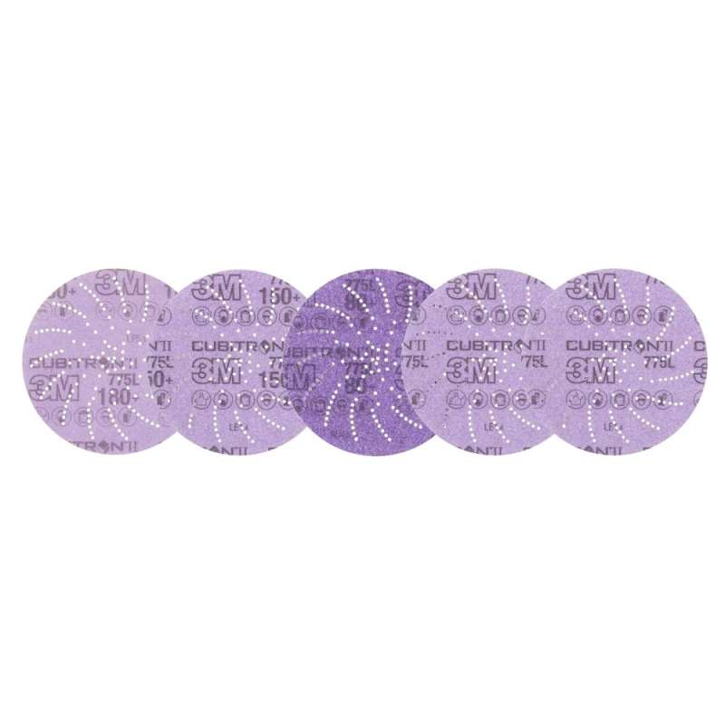 3M Xtract™ Cubitron™ II Disc 775L features a 3M proprietary multi-hole pattern for improved dust extraction in finishing applications. Part of the 3M Xtract™ Series, designed for optimal dust removal. An innovative multi-hole pattern extracts dust better than 5- or 6-hole products — increasing cut and dramatically increasing disc life. The design does not need to align with the disc pad holes, making switching the discs fast, easy and convenient. Featuring ceramic 3M Precision-Shaped Grain, a revolutionary advancement in abrasive technology. The triangular shaped ceramic mineral is designed to slice through the substrate, rather than gouging or “plowing” like conventional abrasives, resulting in a disc that cuts up to 2x as fast as conventional abrasives. The film backing delivers outstanding tear resistance, flexibility and a consistent, uniform finish on a variety of substrates. These discs are ideal for a broad range of applications focused primarily on stock removal, and are effective on a wide variety of substrates, including metals, composites, gelcoat, and whitewood. The film backing offers greater tear resistance than paper discs, for additional durability and edge retention. For best results, pair with 3M™ Elite Random Orbital Sanders. 3M offers a complete line of hook-and-loop style 3M™ Hookit™ discs for work spaces where adhesive backed discs may become contaminated by dust or dirt. They are often used in applications where a 3M™ Stikit™ disc may be too aggressive, as Hookit™ discs tend to leave finer finishes than adhesive backed discs. Hookit™ sanding discs conveniently attach to a hook-and-loop backup disc pad (sold separately), can be removed cleanly and easily, and can be re-used again and again for the extent of the abrasive life. Sandpaper discs cut better and last longer when dust isn't loading the cutting surface of the abrasives. 3M's proprietary multi-hole pattern on Clean Sanding products evacuates dust at a higher rate than 5- or 6-hole products. This hole design doesn't require alignment of holes with the disc pad, making disc changes quick and simple. Open coat construction means the abrasive grains are placed with space between them to help evacuate dust and other sanding debris and avoid clogging the cutting edge of the grains. The load-resistant coating allows the disc to continue cutting even when sanding softwoods, paints, and other materials that would, otherwise, clog the disc and hinder sanding ability. All of this adds up to increased productivity and reduced material consumption. For maximum dust extraction, use this disc with a 3M™ Hookit™ Clean Sanding pad and a random orbital sander with vacuum (both sold separately).