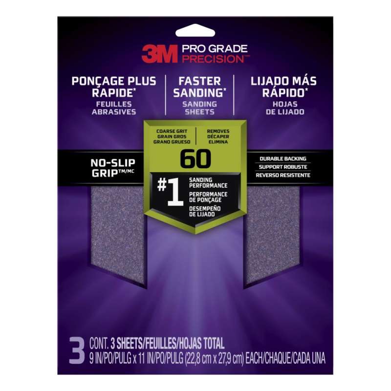 3M™ Pro Grade Precision™ Faster Sanding Sanding Sheets are better than ever, thanks to the combination of NO-SLIP GRIP™ backing and premium mineral technology found in CUBITRON™ II Industrial Abrasives, providing longer sheet life, less effort and less hand fatigue than conventional sandpaper. Get the job done in a flash with the help of 3M™ Pro Grade Precision™ Faster Sanding Sheets. This premium sandpaper makes sanding your surface a breeze with its NO SLIP GRIP™ backing and high quality materials. Each large sheet is perfect for customizing to your needs, and its unique coating resists clogging. Whether you’re sanding wood, drywall, or metal, each sheet can be used on wet or dry surfaces, and the durable backing stands up to the job. Whether you’re working construction or refinishing a piece of furniture, rely on 3M™ Pro Grade Precision™ Faster Sanding Sheets to get the job done right.