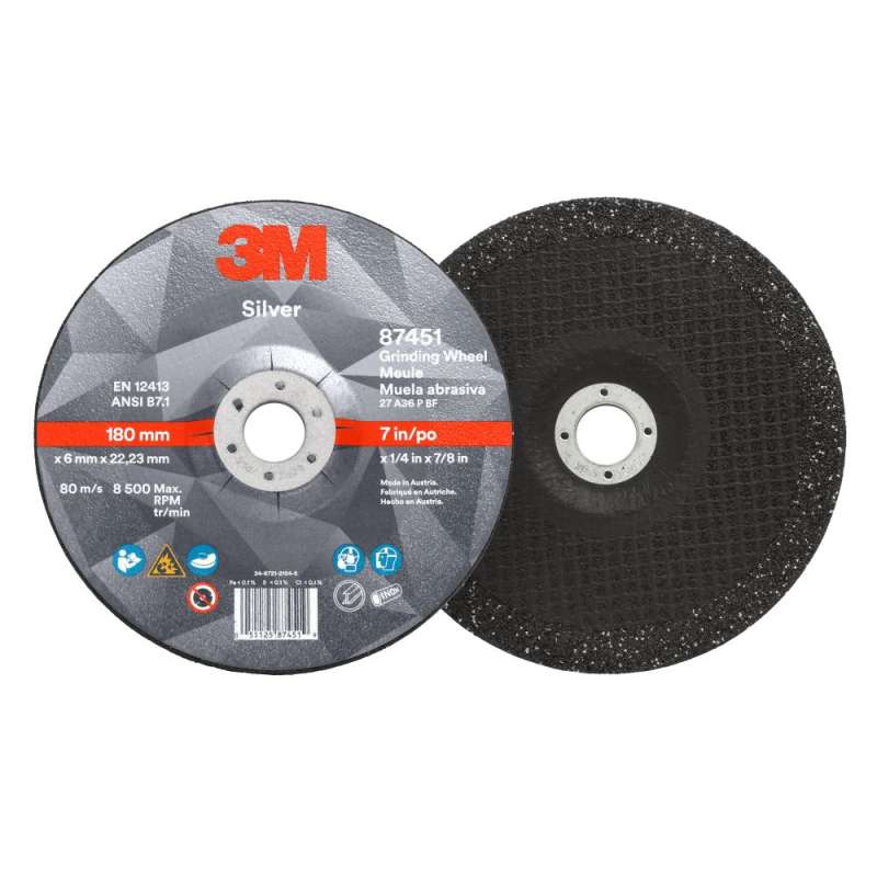 The 3M™ Silver Depressed Center Grinding Wheel is a type 27 wheel designed to deliver an unbeatable combination of performance and value. This long-lasting wheel uses 3M Precision-Shaped Grains to deliver a fast and consistent cut during grinding and heavy stock removal on stainless steel, mild steel, aerospace alloys and more. Discover the benefits of a long-lasting, value-priced grinding wheel. The 3M Silver Depressed Center Grinding Wheel is a type 27 bonded grinding wheel designed to deliver an unbeatable combination of performance and value. These long-lasting wheels use 3M Precision-Shaped Grain to deliver a fast and consistent cut during grinding and heavy stock removal on stainless steel, mild steel, aerospace alloys and more. This ceramic grain lasts exceptionally long, continuously fracturing into super-sharp points and edges that slice cleanly through metal. 3M Silver Grinding Wheels last significantly longer than grinding wheels made with conventional ceramic grain, while maintaining a high cut-rate through the life of the wheel. These 7-inch grinding wheels are suitable for use with either an electric or pneumatic angle grinder. As part of the 3M Advanced Series of abrasives, 3M Silver Depressed Center Grinding Wheels are engineered to deliver high performance at a budget-friendly price. They easily handle heavy grinding tasks like weld grinding, beveling, slag removal and edge work with either pneumatic or electric tools.