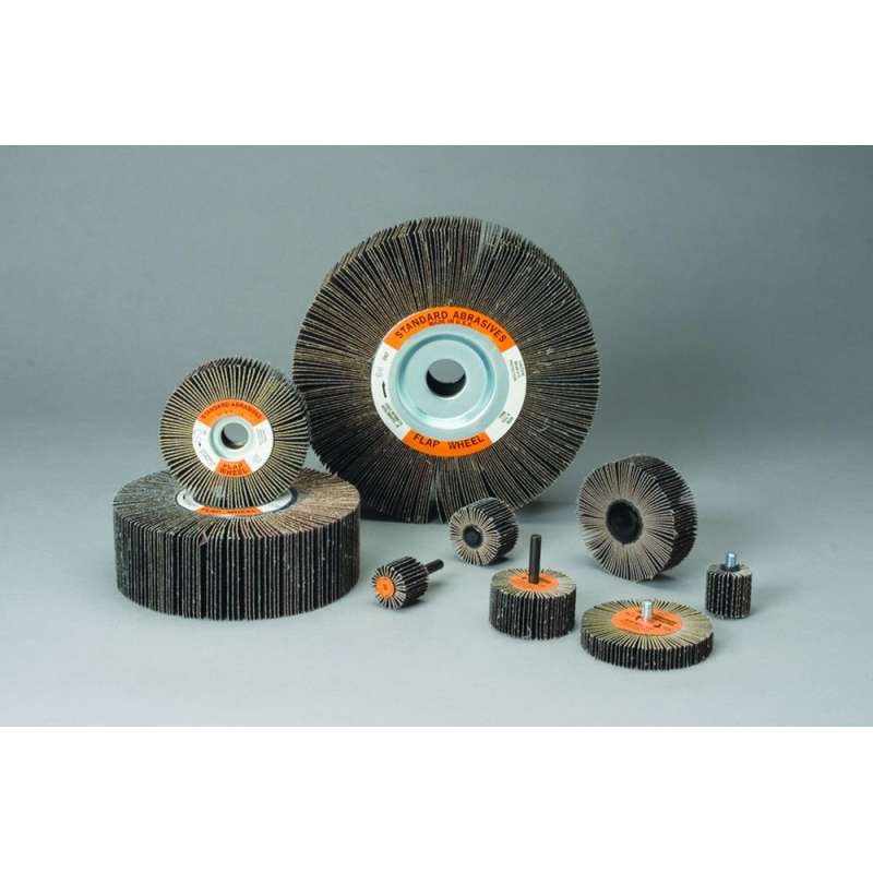 The Standard Abrasives™ Aluminum Oxide Flap Wheel works well on inside and outside diameters of metal workpieces for high stock removal and aggressive blending, finishing and cleaning, and leaves a straight line finish. Choose from a wide range of diameters with different attachment styles to achieve consistent coverage on many different contours and shapes. Flaps Offer Aggressive Cut on Radiused and Contoured Parts A flap wheel comes in handy when faced with the challenge of cleaning up burrs and parting lines on radiused or specially shaped parts where coated discs are not conformable enough or do not have the necessary reach. 3M offers the Standard Abrasives™ Aluminum Oxide Flap Wheel in smaller diameters for attachment to hand-held tools, and larger diameters for off-hand applications. A broad selection of grades is available to deburr edges, remove flash and parting lines, blend machine marks, apply a linear scratch pattern, or provide light blending, cleaning, or polishing. Compared with non-woven products, flap wheels offer a more aggressive cut for cleaning or finishing. If a silicon carbide product is preferred for finishing applications, consider our Standard Abrasives™ Silicon Carbide Flap Wheel, available in 1-3˝ diameters (sold separately). When a job requires even more flexibility for improved finishing, or to reduce dust, use a Standard Abrasives™ Flexible Flap Wheel (sold separately), which has flaps with increased flexibility and a slight radius to the flaps. Some tools may require an additional reducer bushing or adapter for wheel attachment. Small Wheels Access Inner Radiuses and Maintain Maximum Control The flap wheels with smaller diameters provide access to smaller and harder-to-access inner radiuses or contours on irregular parts. These flap wheels are especially useful for cleaning or deburring the insides of tubing. For these smaller areas, flap wheels provide a softer touch than rolls or bands, which are suitable when more aggressive material removal is required. The smaller wheels are 1-3˝ in diameter have a 1/4˝ steel mandrel or a 1/4˝-20 threaded steel shank to enable fast yet secure product change outs. In each case the steel attachment runs the full width of the wheel center, reducing chatter in the rotation. As a result, a smoother finish can be achieved and the operator maintains greater control of the tool with less pressure and increasing productivity. Large Wheels Supply Broader Coverage For larger hand tools or off-hand applications, 3M provides flap wheels in diameters from 3-1/2˝ to 8˝ with 1˝ or 2˝ widths. These sizes have a 5/8˝ or 1˝ center hole compatible with larger tool arbors. The larger wheels contain more flaps per wheel for faster cutting, increased productivity and longer life. Durable Wheel, Fast Cut Aluminum oxide is a popular choice among industrial professionals because of its versatility on different surfaces, fast cut-rate and long life. It is a tough, durable abrasive that self-fractures to expose fresh cutting edges in use, whereas traditional abrasives such as garnet quickly wear down with use. Aluminum oxide mineral is suitable for a wide variety of materials including ferrous and non-ferrous metals. Quality Standard Abrasives™ Products for Industrial Applications The Standard Abrasives brand has supplied quality abrasives to the metalworking industry for over 50 years. Customers rely on 3M's broad offering of high performance products including coated, bonded, and non-woven abrasive lines.