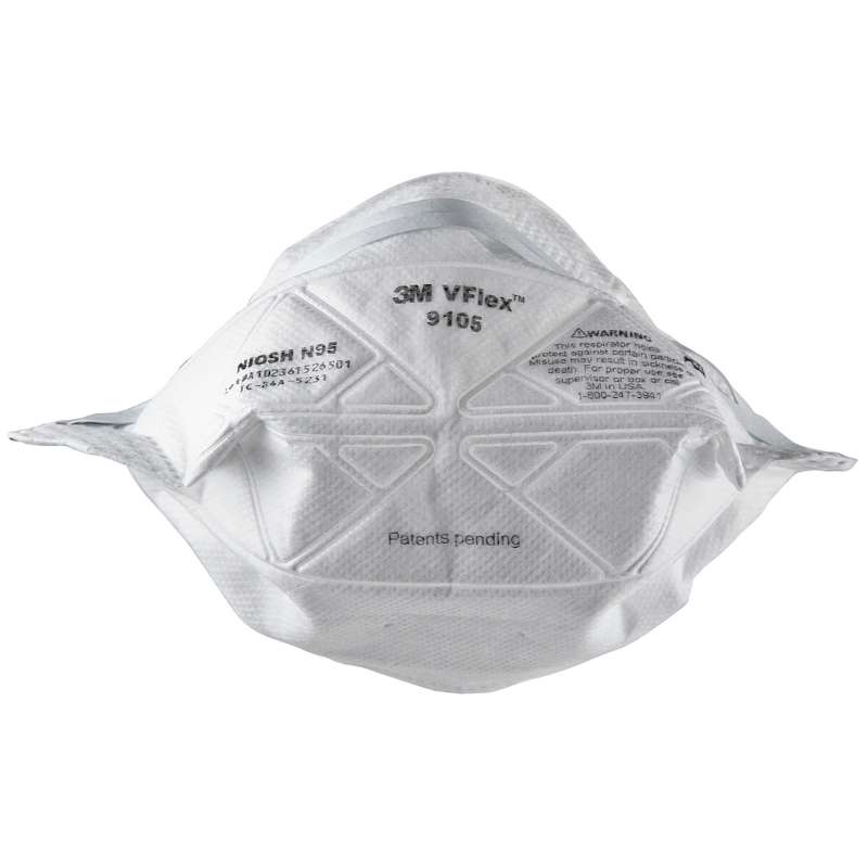 The patented 3M VFlex 9100 Series Particulate Respirators offer an economical option in respiratory protection with many comfort features. The 3M VFlex Particulate Respirator 9105 is a disposable N95 particulate respirator designed to help provide quality, reliable worker respiratory protection for certain non-oil based particles. It has a unique folded design with 3M proprietary filter media and V shaped pleats that expand to help make breathing easier. In addition, the V shaped pleats flex with mouth movement for easier talking. The respirator features uniquely designed tabs for positioning the respirator on the face and embossed front panel to help the respirator retain its shape. Adjustable nose clip helps provide a custom and secure seal. Flat fold design allows for convenient storage prior to use. Compatible with a variety of eyewear and hearing protection. Potential applications/industries include sweeping, sanding, grinding, sawing, bagging, dry chemical handling, emergency preparedness, laboratories, food preparation, mineral processing, agriculture, and general maintenance. Warning: Respirators help protect against certain airborne contaminants. Before use, the wearer must read and understand the User Instructions provided as a part of the product packaging. Follow all local regulations. In the U.S., a written respiratory protection program must be implemented meeting all the requirements of OSHA 29 CFR 1910.134 including training, fit testing and medical evaluation. In Canada, CSA standards Z94.4 requirements must be met and/or requirements of the applicable jurisdiction, as appropriate. Misuse may result in sickness or death. For correct use, consult supervisor and User Instructions, or call 3M Personal Safety Division (PSD) Technical Service in the U.S.A. at 1-800-243-4630. In Canada, call 1-800-267-4414. Disclaimer: 3M industrial and occupational products are intended, labeled, and packaged for sale to trained industrial and occupational customers for workplace use. Unless specifically stated otherwise on the applicable product packaging or literature, these products are not intended, labeled, or packaged for sale to or use by consumers (e.g., for home, personal, primary or secondary school, recreational/sporting, or other uses not described in the applicable product packaging or literature), and must be selected and used in compliance with applicable health and safety regulations and standards (e.g., U.S. OSHA, ANSI), as well as all product literature, user instructions, warnings, and limitations. Misuse of 3M industrial and occupational products may result in injury, sickness, or death. For help with product selection and use, consult your on-site safety professional, industrial hygienist, or other subject matter expert.