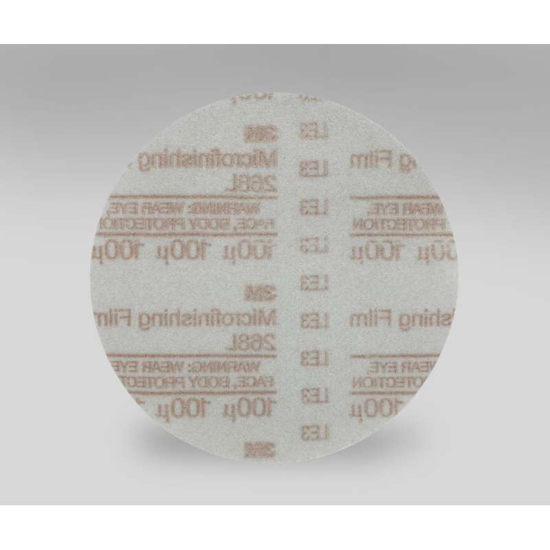 3M™ Hookit™ Microfinishing Film Disc 268L is a fast-cutting abrasive for precise, uniform, close-tolerance finishes. An aluminum oxide mineral is resin-bonded to a 3 MIL, high-strength polyester film backing for durability. This disc is ideal for defect repair and leveling, paint prep and final finishing. Achieve Close-Tolerance Finishes 3M™ Hookit™ Microfinishing Film Disc 268L is designed to enable operators to achieve precise, controlled, close-tolerance finishes on surfaces from metals to plastics to wood. This product features precision, micron-graded aluminum oxide, resin-bonded to a high-strength, resilient polyester film backing. Aluminum oxide is desirable among industrial professionals for its fast cut-rate and long life. Aluminum oxide is suitable for a wide variety of materials in both woodworking and metalworking, including ferrous alloys. It cuts aggressively without significantly altering part geometry, which is great for applications like finishing and paint prep – when you want to maintain the part's original shape. Available in a wide range of grades, these discs are color coded for easy selection of grit and reduced risk of error. Run Wet or Dry These film-backed discs are water resistant, so they can be run wet or dry. Coolant generally extends abrasive life, increases cut rate and prevents loading. The high- strength, film backing maintains its strength and flexibility when paper will degrade when run wet, which makes it an excellent choice for use on a variety of woods and automotive applications. Focus on the Task, Not the Tool with Hookit™ Attachment Microfinishing Film 268L utilizes 3M™ Hookit™ hook-and-loop attachment system which allows the operator to focus more on the task and less on tool. 3M™ Hookit™ products are manufactured with loop material that attaches to a backup pad (sold separately) where tiny hooks firmly engage the loops. Attachment is quick, easy and secure. Sanding, finishing, and surface conditioning products with the hook-and-loop attachment and removal system are efficient for working through multi-step finishing processes and are ideal for environments where dust and debris is common. Abrasive products with a Hookit™ attachment can be used again and again for the life of the abrasive, unlike pressure-sensitive adhesive attachments.