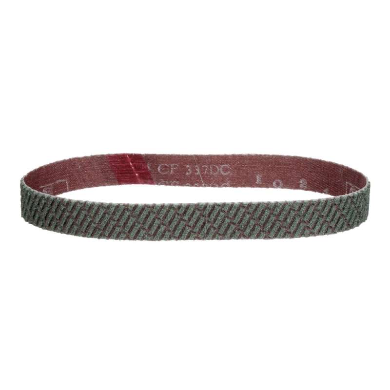 The 3M™ Trizact™ Cloth Belt 337DC delivers consistently in intermediate to final finish, medium pressure applications. Designed with aluminum oxide and a grinding aid on a durable X- weight cloth backing, this belt is available in widths from 1/2 to 24 inches and grades from A300 to A30. Long Life, Sustained Cut, Consistent Performance The 3M™ Trizact™ Cloth Belt 337DC owes its durability and consistent sustained cut rate to its uniquely engineered "bricks and channels" macroreplicated abrasive structure. Uniform abrasive "bricks" keep fresh cutting mineral constantly at the working surface and "channels" sweep debris away to discourage loading and keep the substrate clean. The "bricks" consist of layers of mineral and grinding aid, up to 4 times as much as conventional aluminum oxide belts of the same grade. These dense layers of abrasive mineral lead to extra-long life and extremely consistent performance. The grinding aid protects heat-sensitive alloys from damage and reducing rework. Trizact belts start sharp and stay sharp. The consistent cut Trizact belts deliver can often consolidate or eliminate process steps. In many cases, Trizact™ 337DC has the capacity to grind and finish in one step. Microreplication: Engineering Surface Geometry Building upon the principles of microreplication, 3M scientists developed larger, more diverse abrasive structures —cubes, spheres, ridges — identical in shape and optimized for a variety of applications. Microreplication allows 3M to design abrasives with varying shapes and formulations, to control the level of breakdown, cut, finish and life. These abrasive structures are arrayed precisely and uniformly across a film or cloth backing in a pattern calculated to deliver sustained cut rate and eliminate belt-to-belt variation. Made to Tackle Difficult Metals Trizact was developed especially for finishing more difficult processing materials like titanium, cobalt, stainless steel, as well as all exotic alloys in the aerospace, aviation and medical industries. Also effective for finishing applications on carbon steel, copper, bronze, aluminum, composite materials and synthetics. Recommended Applications Use for dry intermediate finishing, blending, scratch refinement or final dimensioning on robotic, semi-automated, automated, off-hand equipment and portable file belt tools. Use Trizact™ Cloth 337DC belts with: Medium hardness contact wheels (50-70 Shore A) Rubber contact wheels Smooth face to gentle serrated contact wheel To prepare drawn carbon steel truck exhausts from rough to pre-plate finishes in as few steps as possible, we used a grade sequence of A100, A65, A30. Trizact™ 337DC outlasted a competitor by 2:1. For blending, final dimensioning and finishing of turbine engine components, the grade A45 Trizact 337DC belt outlasted a competitor's belt by 4:1 times and produced a finer finish. Creating More Perfect Surfaces Microreplication is only one of 3M's platform of core technologies. Its perfectly calibrated arrays are designed to give materials new physical, chemical, or optical properties. The science that makes 3M's structured abrasives wear more evenly, last longer and provide more pristine finishes on delicate components like medical implants is also the science that makes traffic signs brighter, and exterior building illumination capture and reflect light more brilliantly.