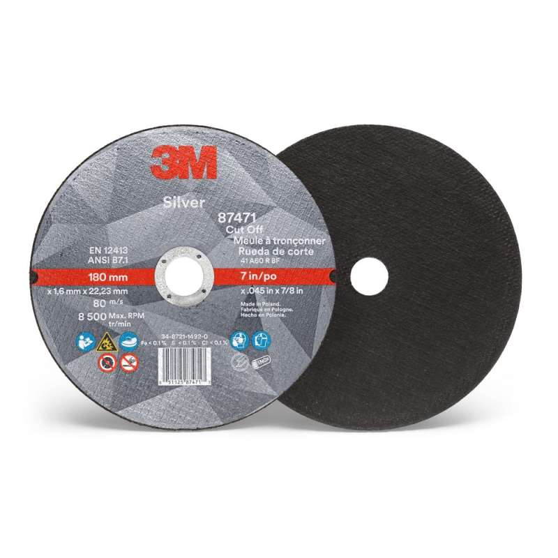 The 3M™ Silver Cut-Off Wheel is designed to deliver an unbeatable combination of performance and value in metal cutting applications. This long-lasting wheel uses 3M Precision-Shaped Grains to deliver a fast and consistent cut through pipes, tubes or flat sheets of stainless steel, mild steel, aerospace alloys and more. Cut the toughest metalworking jobs down to size. The 3M Silver Cut-Off Wheel is designed to deliver an unbeatable combination of performance and value in metal cutting applications. This long-lasting cutting wheel uses 3M Precision-Shaped Grain to deliver a fast and consistent cut through pipes, tubes or flat sheets of stainless steel, mild steel, aerospace alloys and more. This ceramic grain lasts exceptionally long, continuously fracturing into super-sharp points and edges that slice cleanly through metal. 3M Silver Cut-Off Wheels last significantly longer than metal cutting wheels made with conventional ceramic grain, while maintaining a high cut-rate through the life of the wheel. These 7” metal cutting wheels can be used with either pneumatic or electric grinder tools and feature a flat, type 1 cutting surface profile. The 3M Silver Cut-Off Wheel is part of the 3M Advanced Series of abrasives, for operators who want a high-performance cutting wheel without the premium price. Their long-lasting performance combined with a value price can help lower your overall abrasive spend.