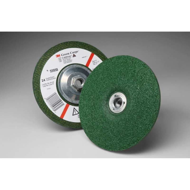 3M™ Green Corps™ Type 27 Depressed Center Wheel is a grinding wheel designed for heavy stock removal on most materials, including ferrous metals, stainless steels, alloy steels and cast iron. Get up and Grind 3M™ Green Corps™ Type 27 Depressed Center Wheel is a heavy-duty wheel designed to perform at the beginning of a project; as a grinding wheel, it's often the first step in a sequence. Use this wheel for rough grinding applications like beveling, slag removal, weld grinding and edge work on a variety of metals. 3M™ Ceramic Abrasive Grain Helps with Fast Cut and Long Life Abrasives made with 3M™ Ceramic Abrasive Grain have outstanding durability, cut exceptionally fast and have a long service life. This grain is a proprietary ceramic mineral formed using a process to enhance toughness and hardness of the grain. It is chemically engineered with a unique "stay sharp" crystalline structure, which continually reveals fresh cutting edges on the surface of the disc ensuring extended high performance and real productivity benefits. Type 27 Wheels and Tips for Optimal Use Type 27 grinding wheels should be used with an approved grinding wheel guard. it's important the disc not extend beyond the lip of the guard, because the guard helps prevent debris from flying and injuring operators. The depressed center on Type 27 wheels enable flanges or metal attachment systems to recess within the wheel. When depressed center wheels attach to the tool, these attachment systems will not gouge the substrate or inhibit performance. A grinding wheel must be run on a right angle grinder with a wheel guard that is designed specifically for the size and type of wheel used. The grinding wheel must have a listed maximum operating speed greater than or equal to the maximum listed speed of the grinder used. Altogether, 3M™ Green Corps™ Type 27 Depressed Center Wheel is a durable wheel designed to tackle some of the most aggressive grinding applications.