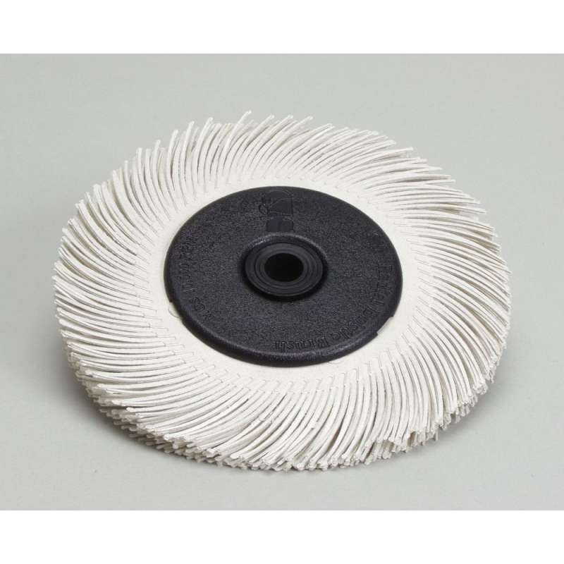 Scotch-Brite™ Radial Bristle Brush Replacement Discs can be used to refill or expand the width of our Scotch-Brite™ Radial Bristle Brush (brush adapter sold separately). The molded, flexible bristles are filled with proprietary 3M™ Ceramic Abrasive Grain blend and provide a high quality finish with minimal pressure. Use the brush to effectively clean, finish, polish and deburr irregular surfaces. Replace Wire Brushes, Use Less Pressure Scotch-Brite™ Radial Bristle Brush Replacement Discs provide more surface contact than wire brushes and maintain abrasiveness throughout the life of the brush. Moreover, the Scotch-Brite™ Radial Bristle Brush provides a safer alternative to wire brushes by eliminating the risk of flying wires being ejected from the brush. Under normal use, the flexible bristles remain safely in place and can achieve the desired finish using light pressure. Applications Bristle brush discs feature firm yet flexible bristles that produce uniform finishes around protrusions, detail grooves, patterns and other hard-to-reach areas. They conveniently remove paint, stains, adhesives, weld burns, rust, heavy oxides, and surface contaminants. The discs work well on aluminum, brass, bronze, carbon steel, cast iron, stainless steel, and other metals. Applications include general industrial, aerospace, automotive, metalworking and transportation as well as fine detailing requirements of electronics, jewelry and woodworking industries. High Cut-Rate and Excellent Durability 3M™ Ceramic Abrasive Grain is a ceramic mineral manufactured using one of our proprietary processes to enhance toughness and hardness of the grain. For increased performance, Scotch-Brite™ Radial Bristle Brush Replacement Discs feature aluminum oxide blended with ceramic abrasive grain for one of the hardest, longest-lasting minerals available. 3M™ Ceramic Abrasive Grain surpasses aluminum oxide abrasives in cut-rate, durability, and makes an excellent choice for industrial grinding and finishing applications. Scotch-Brite™ industrial abrasives are unique surface conditioning products designed to deliver quality, consistent results for the life of the product. Choose from a range of sizes and grits to suit unique project requirements.
