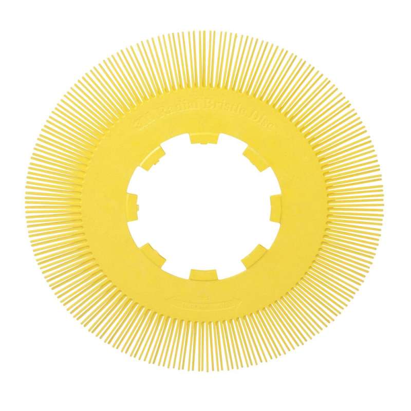 Scotch-Brite™ Radial Bristle Brush Replacement Discs can be used to refill or expand the width of our Scotch-Brite™ Radial Bristle Brush (brush adapter sold separately). The molded, flexible bristles are filled with proprietary 3M™ Ceramic Abrasive Grain blend and provide a high quality finish with minimal pressure. Use the brush to effectively clean, finish, polish and deburr irregular surfaces. Replace Wire Brushes, Use Less Pressure Scotch-Brite™ Radial Bristle Brush Replacement Discs provide more surface contact than wire brushes and maintain abrasiveness throughout the life of the brush. Moreover, the Scotch-Brite™ Radial Bristle Brush provides a safer alternative to wire brushes by eliminating the risk of flying wires being ejected from the brush. Under normal use, the flexible bristles remain safely in place and can achieve the desired finish using light pressure. Applications Bristle brush discs feature firm yet flexible bristles that produce uniform finishes around protrusions, detail grooves, patterns and other hard-to-reach areas. They conveniently remove paint, stains, adhesives, weld burns, rust, heavy oxides, and surface contaminants. The discs work well on aluminum, brass, bronze, carbon steel, cast iron, stainless steel, and other metals. Applications include general industrial, aerospace, automotive, metalworking and transportation as well as fine detailing requirements of electronics, jewelry and woodworking industries. High Cut-Rate and Excellent Durability 3M™ Ceramic Abrasive Grain is a ceramic mineral manufactured using one of our proprietary processes to enhance toughness and hardness of the grain. For increased performance, Scotch-Brite™ Radial Bristle Brush Replacement Discs feature aluminum oxide blended with ceramic abrasive grain for one of the hardest, longest-lasting minerals available. 3M™ Ceramic Abrasive Grain surpasses aluminum oxide abrasives in cut-rate, durability, and makes an excellent choice for industrial grinding and finishing applications. Scotch-Brite™ industrial abrasives are unique surface conditioning products designed to deliver quality, consistent results for the life of the product. Choose from a range of sizes and grits to suit unique project requirements.
