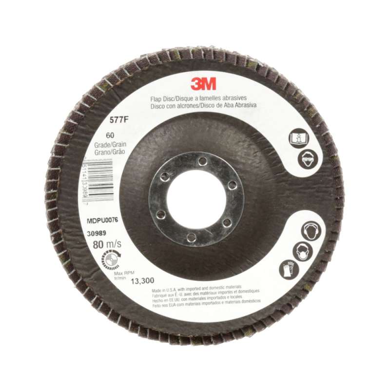 3M™ Flap Disc 577F tackles the toughest high-pressure metalworking applications and leaves a blended finish, all in a single step. This abrasive flap disc features fast-cutting alumina zirconia mineral on durable polyester-backed flaps for extra cutting power, and long life on heavy duty applications such as weld removal, sharp-edge work, and beveling. Ideal for tough grinding applications where final finish is important, the overlapping layers of the flaps on 3M™ Flap Disc 577F continually wear away with use to expose fresh abrasive mineral for a fast, consistent cut, while the cushioning of the flaps creates a blended finish. Flap discs typically generate a finish one grade finer than the disc is graded, reducing finishing steps. A grinding aid reduces grinding temperatures for processes involving heat-sensitive alloys such as stainless steel, nickel alloys, and titanium. Flap discs are used on a right angle grinder. Giant size flap discs have the same diameter as standard flap discs but wider flaps. The wider flaps create extra-thick layers and are packed with 25% more abrasive material than on standard flap discs, for more aggressive cut and longer life. Flap discs are three-dimensional grinding discs with overlapping layers of abrasive-coated, fiber-reinforced flaps that fan out from a central hub. These flaps continually wear away with use to expose fresh mineral for a fast, consistent cut. The one-step alternative to bonded wheels and fiber discs, flap discs grind and finish in a single step, making them a time and cost-saving solution in many typical applications. Under normal conditions, flap discs will generate a finish that is one grade finer than the finish of a fibre disc of the same grade. And, because their overlapping construction allows more abrasive material to be loaded onto the cutting surface, they far outlast typical discs. Flap discs have the flexibility to easily follow curves and contours while delivering less gouging and enhancing operator comfort. They are ideal for a wide range of applications, including weld grinding, deburring, rust removal, edge grinding, and weld seam blending.