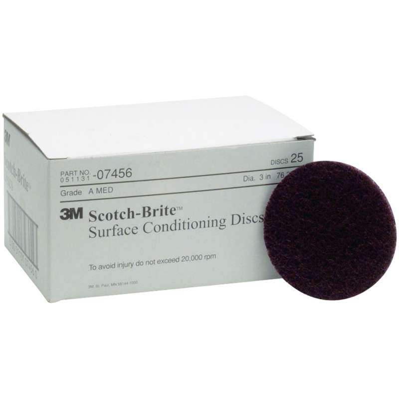 Scotch-Brite™ Surface Conditioning Disc comes in a wide variety of grades and sizes and is an ideal first-step for cleaning, blending, deburring, and finishing. Durable, non-woven fiber construction conforms well on irregular or contoured surfaces without undercutting or damaging the base material. The open-web material runs cool and resists loading to enable prolonged operation while evenly distributed aluminum oxide abrasives produce a high cut-rate for consistent finishing. The Scotch-Brite™ Surface Conditioning Disc uses aluminum oxide abrasive. Aluminum oxide is a popular choice among industrial professionals because of its cut-rate and long life. This mineral is a tough, durable abrasive that self-fractures to expose fresh cutting edges in use, whereas traditional abrasives, such as garnet, quickly wear down with use. Due to its high cut-rate, hardness, strength, and low heat retention, aluminum oxide mineral is widely used in grinding applications in addition to sanding and finishing use. Aluminum oxide is suitable on a wide variety of substrates in both woodworking and metalworking, including ferrous alloys. Scotch-Brite™ industrial abrasives are unique surface conditioning products with abrasives incorporated into non-woven nylon or synthetic fibers. Combining abrasives with the fibers creates an abrasive system that delivers consistent results for the life of the product. The open-web material runs cool and is load resistant, which keeps the abrasive minerals cutting at high performance by limiting clogging of the fibers.