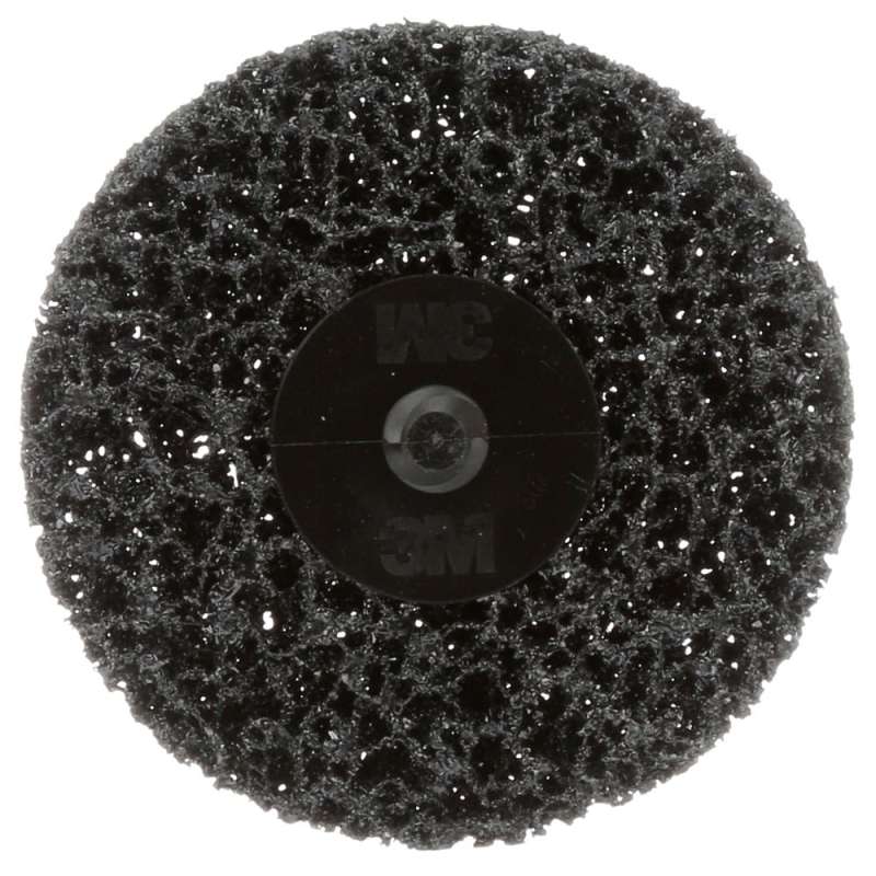 Scotch-Brite™ Roloc™ Coating Removal Disc features extra coarse silicon carbide abrasive to effectively remove paint and rust from metal surfaces and welds. Together with the conformable, non-woven material, silicon carbide abrasives remove coatings without gouging, undercutting, or damaging the base material, especially on hard surfaces. The open-web material runs cool and resists loading, keeping the abrasives actively cutting for consistent results over the life of the product. The Scotch-Brite™ Roloc™ Coating Removal Disc provides more surface area than wire brushes. It is also safer as there are no wires to fly loose and the hook and loop backing holds the disc securely in place during use. The 3M™ Roloc™ TR quick attachment and removal feature also provides fast and easy disc change-out when performing multi-step finishing processes. Scotch-Brite™ Roloc™ Coating Removal Disc uses silicon carbide abrasive. Silicon carbide is a synthetic mineral that is very sharp and commonly used for low-pressure applications such as paint prep. While it breaks down faster than aluminum oxide, it produces a superior finish. Scotch-Brite™ industrial abrasives are a unique surface conditioning product with abrasives incorporated into non-woven nylon or other synthetic fibers. Combining abrasives into the fibers creates an abrasive system that delivers consistent results for the life of the product. The open-web material is load resistant and keeps the abrasive minerals cutting at high performance by limiting clogging of the fibers. 3M™ Roloc™ TR quick change discs are smaller discs that have a plastic threaded button or screw designed to easily and quickly screw onto a 3M™ Roloc™ TR disc pad (sold separately) so that operators can conveniently change discs with a simple twist-off, twist-on motion. The Roloc™ TR system provides a secure attachment even for heavy-duty applications, and the variety of available 3M Roloc discs allows swapping from one application to the next in seconds.