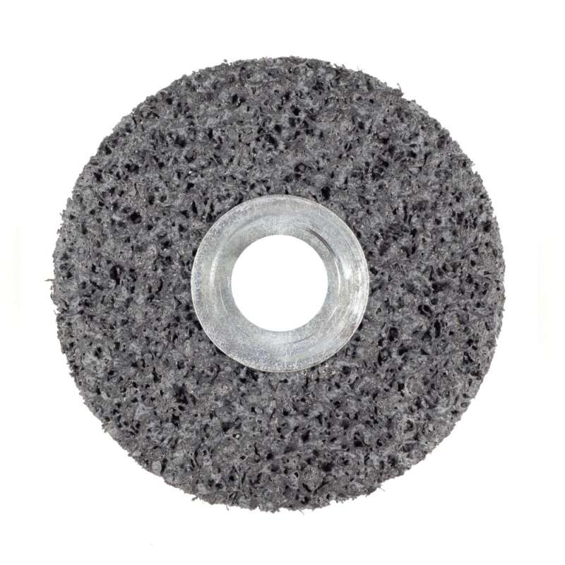 The Scotch-Brite™ Clean and Strip Unitized Wheel is a unitized wheel made for aggressive coating removal, cleaning welds, and removing rust, paint and coatings. The layered, durable unitized wheel construction and hard 7 density, with low conformability, make it a great match for edges, when durability is a must. Remove Unwanted Coatings Among its features, the Scotch-Brite™ Clean and Strip Unitized Wheel has a few abrasive elements that make it uniquely suited for applications like coating removal. First, it has a durable unitized construction that won't yield or deflect to surface irregularities, ensuring an ongoing, aggressive cut. Second, it is made with open web, which helps minimize clogging and loading when removing these coatings. Peeling back the paint, here's how the Scotch-Brite™ Clean and Strip Unitized Wheel is engineered. To help with your toughest cleaning applications, extra coarse (XCS) silicon carbide mineral is interspersed on synthetic fibers using resin. The coarse grade helps the abrasive cut more aggressively than minerals of a finer grade. While silicon carbide breaks down faster than aluminum oxide, it produces a brighter finish. It cuts sharply to effectively remove scale, rust, surface contaminants, paints, coatings, weld discoloration and splatter. The unitized construction of the Scotch-Brite™ Clean and Strip Unitized Wheel further lends itself to aggressive cutting action. To create a unitized wheel, layers of open web material compressed together during wheel production. Having multiple layers melded together enhances the abrasive's overall ability to aggressively tackle the substrate. Resist Loading Finally, the open web helps with the loading that is commonly found in high-production environments and during soft coating removal. Gaps between the nylon fibers permit debris to escape, minimizing loading and premature clogging – which, in turn, prolongs abrasive service life. As the fibers break down, they reveal fresh, sharp mineral, so you get a consistent cut – part after part. This dense and durable wheel works well with a variety of portable tools, including die grinders, to reach tight or confined areas. When it comes to peeling back the paint, trust the Scotch-Brite™ Clean and Strip Unitized Wheel to help you unearth the layers underneath.