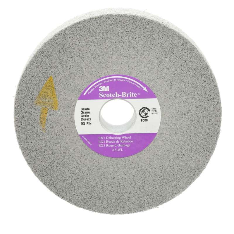 Scotch-Brite™ EX3 Deburring Wheel is a convolute-constructed, hard, durable deburring wheel suited for applications where edge retention is a must. The wheel performs best when consistently presented with a sharp edge or metal burrs. A unique resin system resists smearing and heat buildup. Scotch-Brite™ EX3 is an effective wheel to deburr, blend, finish and polish edges on glass, hard and soft composites, and metals such as builder's hardware, medical instruments, metal fabrication, metal implants, plumbing fixtures, and turbine engines. Because of its hard density, the EX3 is not recommended for applications where conformability and finishing of flat surfaces are required. Scotch-Brite™ EX3 Deburring Wheel is available with silicon carbide or aluminum oxide abrasive mineral. Silicon carbide is a synthetic mineral that is very sharp and commonly used for low-pressure applications such as paint prep and finishing. Aluminum oxide is a hard, blocky mineral that provides high cut-rate and long life. While silicon carbide breaks down faster than aluminum oxide, it produces a finer finish. Scotch-Brite™ industrial abrasives are unique surface conditioning products with abrasives incorporated into non-woven nylon or synthetic fibers. Combining abrasives with the fibers creates an abrasive system that delivers consistent results for the life of the product. The open-web material runs cool and is load resistant, which keeps the abrasive minerals cutting at high performance by limiting clogging of the fibers.