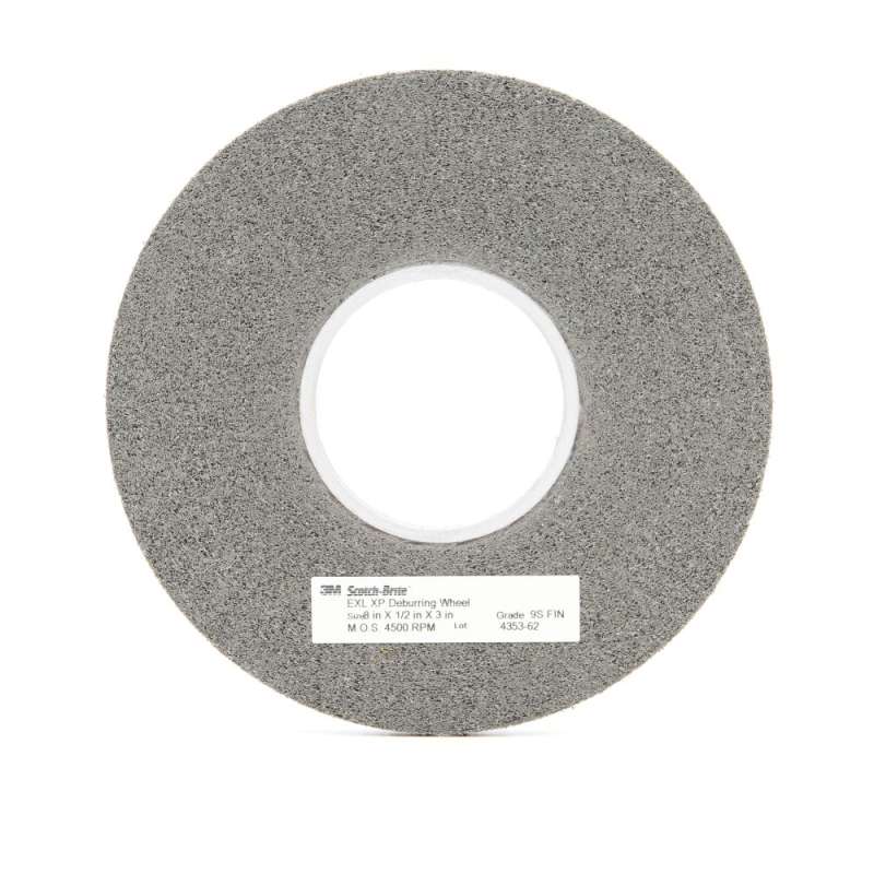The Scotch-Brite™ EXL-XP Deburring Wheel offers superior durability and edge retention for tackling tough burrs and sharp edges on all types of metals, composites and glass. The EXL-XP wheel is designed to deliver a high cut rate and smooth running over the life of the wheel. Offering Ultimate Durability and Edge Retention The Scotch-Brite™ EXL-XP Deburring Wheel is constructed with a resin system and convolute construction that allows the wheel to run true and consistently while keeping fresh mineral exposed to do the work. Wheel hardness, edge retention, and consistent cut combine to help resist "chunking," so the wheel continues to run true. Smooth running and fast cutting reduce operator fatigue while wheel hardness and exposed mineral deliver long life and consistent finishing. Scotch-Brite™ EXL-XP Deburring Wheel is filled with fine (FIN) silicon carbide mineral. Silicon carbide is a synthetic mineral that is very sharp and commonly used for low-pressure applications such as paint prep. While it breaks down faster than aluminum oxide, it produces a superior finish. The Science of Smooth The Scotch-Brite™ line of surface conditioning products includes a variety of non-woven synthetic fiber webs and molded wheels impregnated with abrasive minerals. These products are well-suited for cleaning, blending, deburring, finishing and polishing, and improve surfaces without significantly changing the shape or dimension of the workpiece. Scotch-Brite™ abrasives run cool, and resist loading due to their open web construction. This reduces the risk of part discoloration and warping, while extending the life of the wheel. They're designed to help you achieve the surface finishes and part tolerances you desire – making your applications fast, easy and efficient.