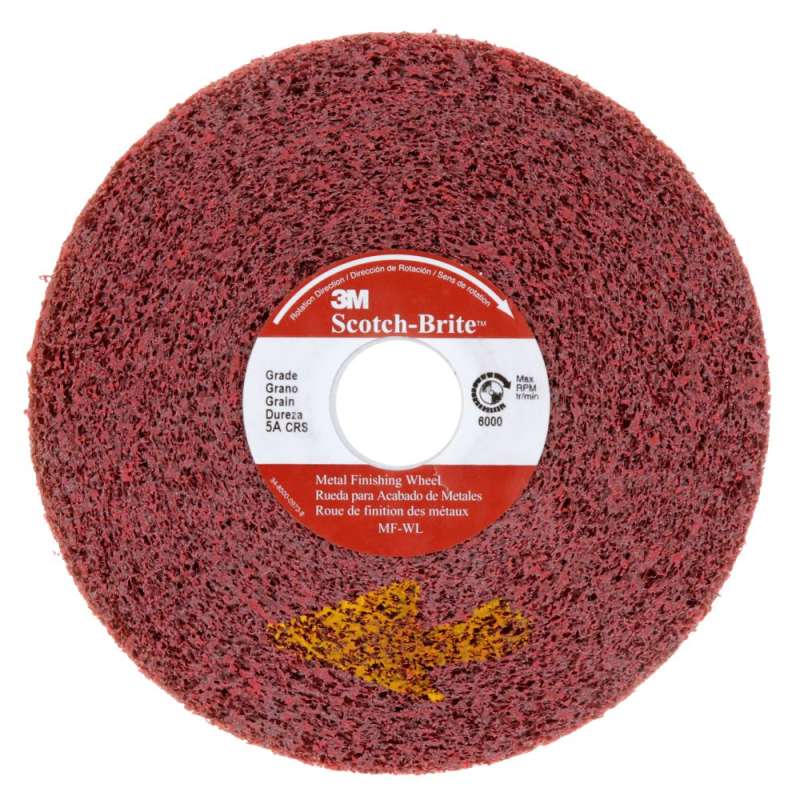 Scotch-Brite™ Metal Finishing Wheel combines conformability with consistent abrasive cutting action to provide uniform brushed stainless and satin finishes. The Metal Finishing Wheel is also used effectively to blend and match #3 or #4 mill finishes on stainless steel and to create brushed or satin finishes on items such as cutlery, appliance trim, builders hardware, and plumbing fixtures. On softer metals like aluminum, copper, and brass, Scotch-Brite™ Metal Finishing Wheels are used to blend out minor surface imperfections and handling marks while providing the desired decorative finish on products such as builder's hardware, and plumbing fixtures. Typically used on stationary machinery, the wheels are available in diameters of 6 to 16 inches and widths of 1/2 inch and greater. This highly conformable wheel is convolutely wound on a core to run smoothly and help create professional finishing results. Available in grade CRS and MED. Scotch-Brite™ Metal Finishing Wheel uses aluminum oxide abrasive. Due to its high cut-rate, hardness, strength, and low heat retention, aluminum oxide mineral is widely used in grinding applications in addition to sanding and finishing use. Aluminum oxide is suitable on a wide variety of substrates in both woodworking and metalworking, including ferrous alloys. Scotch-Brite™ industrial abrasives are unique surface conditioning products with abrasives incorporated into non-woven nylon or synthetic fibers. Combining abrasives with the fibers creates an abrasive system that delivers consistent results for the life of the product. The open-web material runs cool and is load resistant, which keeps the abrasive minerals cutting at high performance by limiting clogging of the fibers.