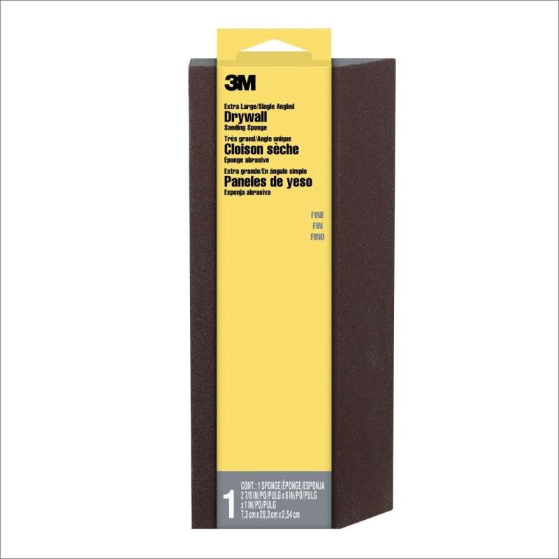 3M™ Detail Area/Angled Drywall Sanding Sponge is ideal for sanding drywall and plaster during spot repair. When finished, simply rinse and reuse. Available in fine grade. 3M™ Extra Large Angled Drywall Sanding Sponge 910 DSA, 3 5/16 in x 9 in x 1 in 24 cs Fine, Open Stock. 3M™ Sanding Sponges are designed for wet or dry sanding on drywall. Use this fine grit sponge for smoothing patch and repair on walls. This sponge features conventional 3M abrasives and is made with durable, flexible foam. Sanding is an integral step in preparing a surface to receive a coating. For the best sanding results, sand with the grain of the surface and work through a sequence of grits, from coarse to very fine, skipping no more than one grit between each sanding step. 3M sanding sponges are available in medium, fine and extra fine grits. Sponge material allows abrasive mineral to form into corner, eliminating gouging. Durable, abrasive mineral coating lasts longer than regular sandpaper