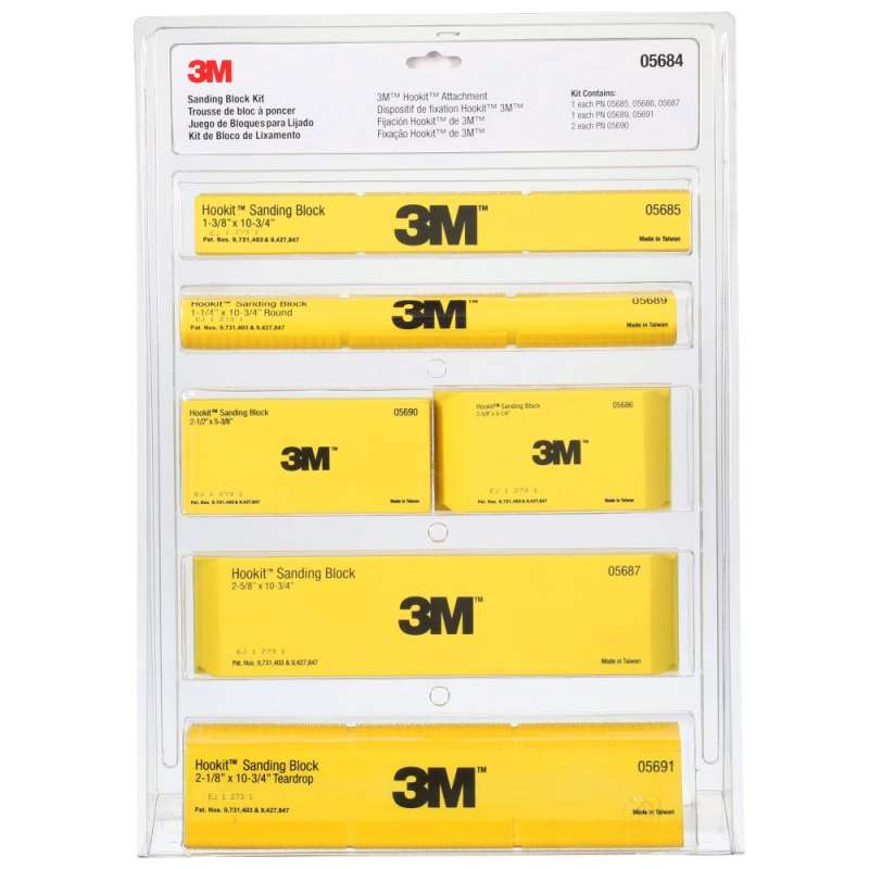 3M™ Hookit™ Sanding Block helps make sanding easier in difficult locations. Use this accessory item with our Hookit™ abrasive products to achieve more consistent, uniform sanding results. This sanding block when used in combination with Hookit™ abrasives is ideal for sanding filler, primer and other substrates. 3M™ Hookit™ Sanding Block Kit 05684 makes it easy to reach difficult, out-of-reach areas when sanding. Change sandpaper and abrasive sheets quickly with the 3M™ Hookit™ Sanding Block Kit and the 3M™ Hookit™ system, offering faster change-outs of abrasive sheet material. 3M™ Hookit™ Sanding Block Kit 05684 helps increase your control and helps deliver uniform results - it’s easy to use from start to finish. Block sizes include 1-3/8 in x 10-3/4 in, 1-1/4 in x 10-3/4 in Round, 2-1/2 in x 5-3/8 in, 2-5/8 in x 5-1/4 in, 2-5/8 in x 10-3/4 in, and 2-1/8 in x 10-3/4 in Teardrop. This must-have addition to your auto shop is ideal for delicate work on many substrates and consistently delivers throughout its long product life.