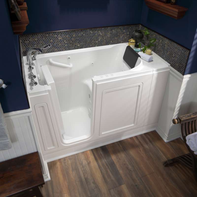The American Standard 28-in x 48-in Acrylic walk-in bath provides a similar bathing experience to larger models but fits in smaller spaces and uses less water. The included tub extender allows this tub to retrofit in the same space as a standard bathtub. The full sized, contoured door with a low door threshold allows ease of entry and exit. Fully equipped, the 119 Luxury Series offers all the latest in safety and comfort features with the most advanced therapeutic options therapeutic options and backed by a lifetime warranty on the door seal, a 15 year warranty on the tub shell and a 10 year warranty on all other components.
