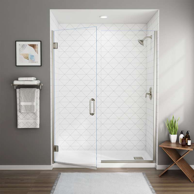 Elevate the look of your bathroom with the Frameless Swing Shower Door with Panel from American Standard. Clear, 3/8” thick tempered safety glass creates an airy, open ambiance and features a protective coating that helps to repel water and spotting for a longer-lasting shine and easy cleaning. Simple yet sophisticated, this frameless look is supported by sturdy metal hinges designed to last a lifetime.