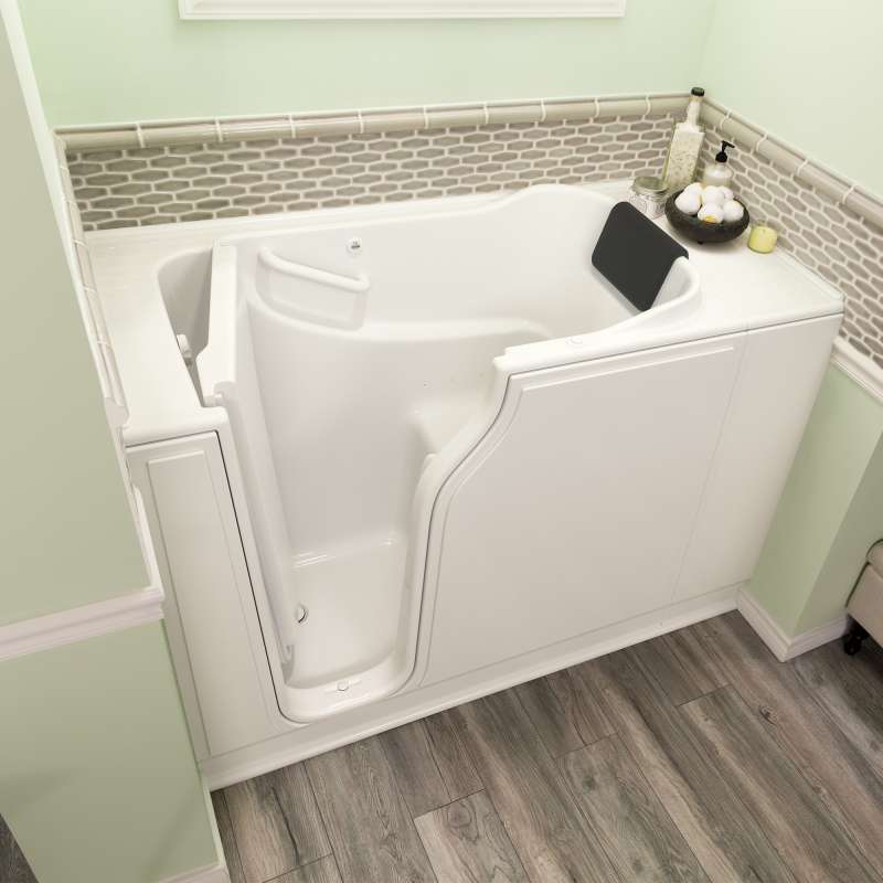 The American Standard 30-in x 52-in Gelcoat walk-in bath provides a similar bathing experience to larger models but fits in smaller spaces and uses less water. The included tub extender allows this tub to retrofit in the same space as a standard bathtub. The full sized, contoured door with a low door threshold allows ease of entry and exit. Fully equipped, the 105 Premium Series offers all the latest in safety and comfort features with the most advanced therapeutic options and backed by a lifetime warranty on the door seal, a 10 year warranty on the tub shell and a 5 year warranty on all other components.