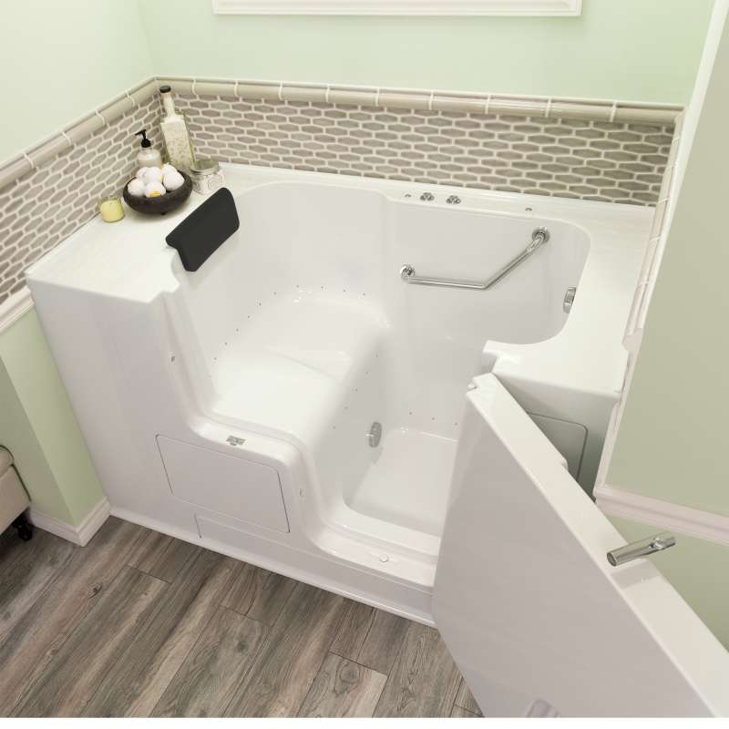 The American Standard 32-in x 52-in Gelcoat walk-in bath provides a similar bathing experience to larger models but fits in smaller spaces and uses less water. The included tub extender allows this tub to retrofit in the same space as a standard bathtub. The full sized, outward opening, contoured door with a low door threshold allows ease of entry and exit. Fully equipped, the 105 Premium Series offers all the latest in safety and comfort features with the most advanced therapeutic options and backed by a lifetime warranty on the door seal, a 10 year warranty on the tub shell and a 5 year warranty on all other components.