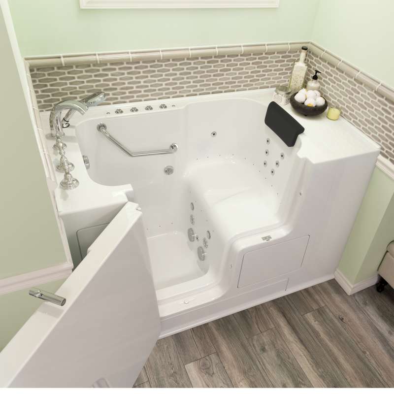 The American Standard 32-in x 52-in Gelcoat walk-in bath provides a similar bathing experience to larger models but fits in smaller spaces and uses less water. The included tub extender allows this tub to retrofit in the same space as a standard bathtub. The full sized, outward opening, contoured door with a low door threshold allows ease of entry and exit. Fully equipped, the 109 Premium Series offers all the latest in safety and comfort features with the most advanced therapeutic options and backed by a lifetime warranty on the door seal, a 10 year warranty on the tub shell and a 5 year warranty on all other components.