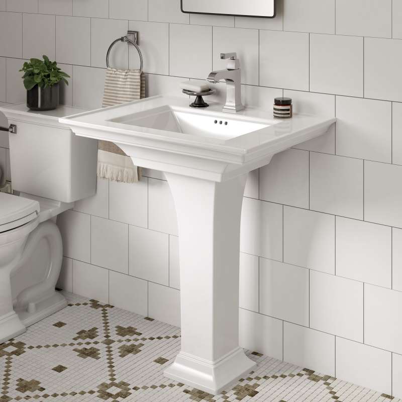American Standard Town Square S Single-Handle Faucet makes a statement in the bathroom with its meticulously designed silhouette, detailed with architectural elements and inspiration from crown molding. This single-hole faucet is easy to install, with the inclusion of a push-pop drain, and can be installed on a 3-hole sink with the use of an optional escutcheon deck plate, sold separately. As an EPA WaterSense Certified faucet, with a maximum flow rate of 1.2 gallons per minute, the faucet helps to save water when compared to a standard faucet. Available in beautiful tarnish- and scratch-resistant finishes, the faucet also coordinates with the rest of the Town Square S collection, a full offering of bathroom fittings and fixtures, making your next bathroom remodel simple.