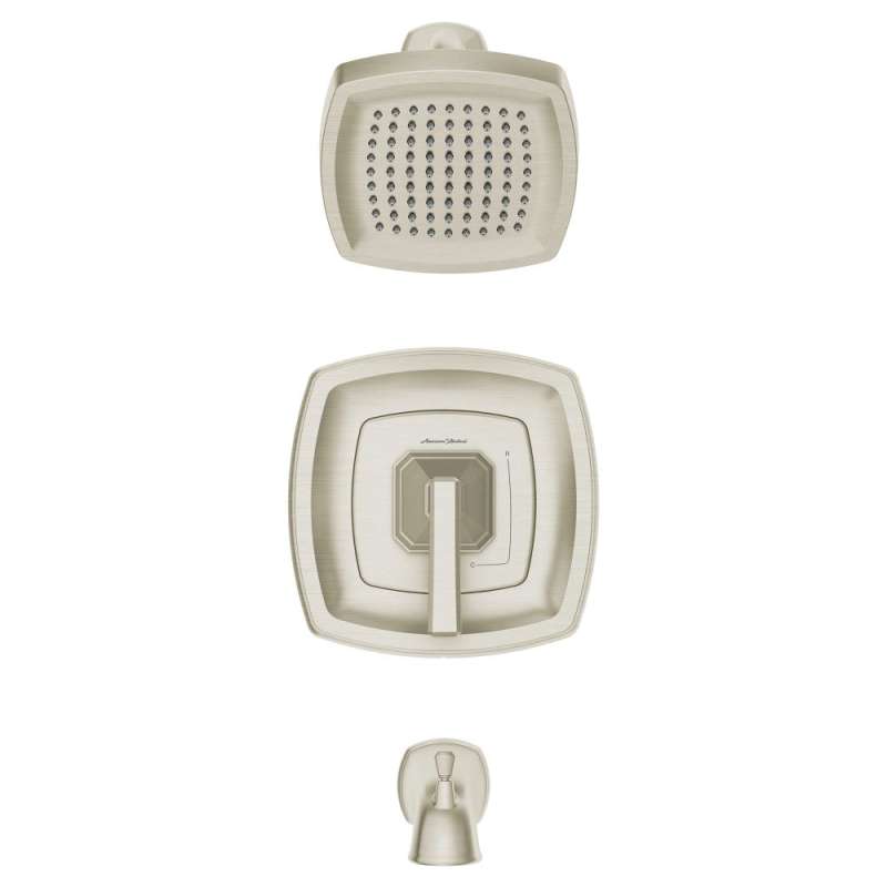 - Includes single-function showerhead and arm, pressure balance valve cartridge, metal diverter tub spout