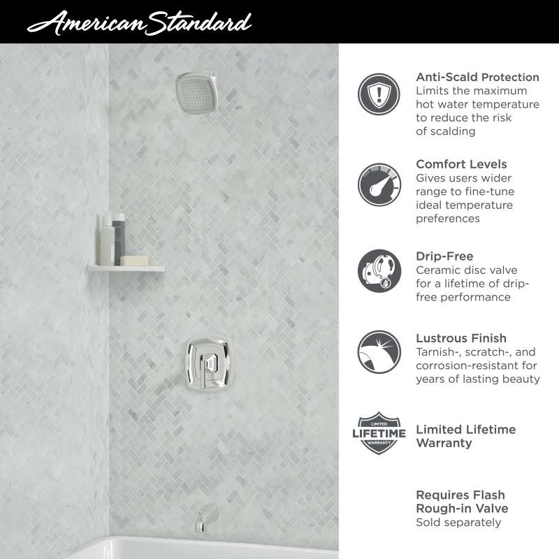 Graceful lines and superior performance set the Crawford Tub and Shower Trim Kit from American Standard apart from most. Equipped with dependable, pressure balance technology for consistent water temperature, anti-scald protection, and smooth, flawless operation. This transitional style features graceful, tapered lines and subtle details designed to add a touch of casual elegance to every décor from traditional to contemporary. The Crawford collection combines beauty, dependability, and superior, drip-free performance for life. Requires Flash Rough-in Valve, sold separately.