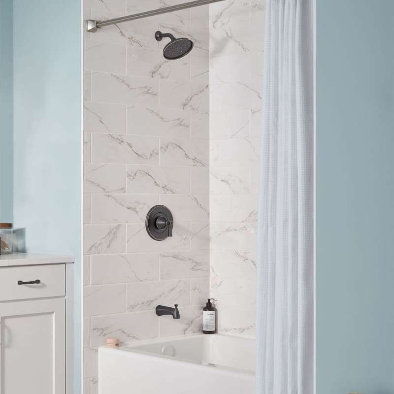 - Includes single-function showerhead and arm, pressure balance valve cartridge, and diverter tub spout