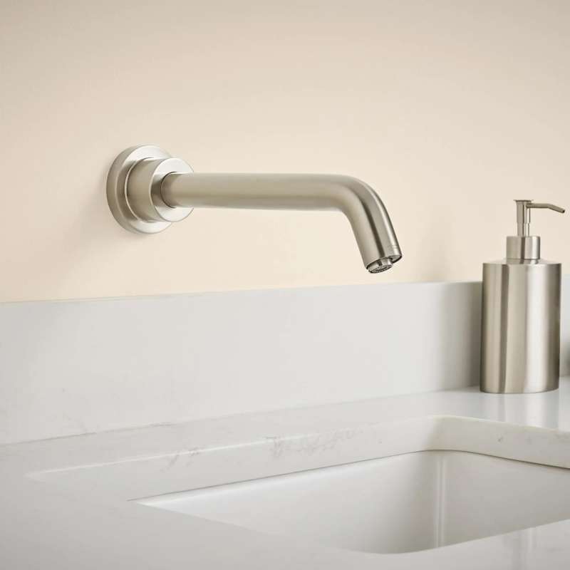 The Serin Wall-Mount Touchless Faucet from American Standard is part of our simplified 3-step modular ordering process for sensor faucets. Choose a faucet style, control box and power supply to meet the specific needs of every installation. This touchless faucet is a streamlined design that features a self-adjusting sensor in the tip of the spout that sets the activation range upon start-up by evaluating sink size and other factors. Hidden sensor and durable brass body reduces vandalism in high-traffic applications. Designed for easy installation and compatibility with solenoid only or solenoid + thermostatic mixing valve control box, and choice of power supply, each required and sold separately. Also requires rough-in valve R350, sold separately.