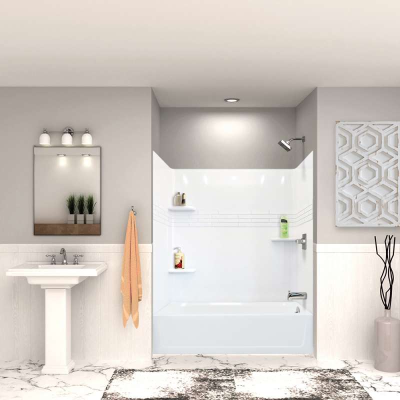 Effortless upgrade your bathroom with Mustee all-in-one bath/shower kits! These kits feature a timeless and classic design, meticulously crafted from premium materials to ensure years of lasting quality. They are designed for easy cleaning and maintenance, plus they're resistant to mold and mildew, making them a practical choice for any home. Transform your bathroom effortlessly with Mustee! Kit includes 60-in x 30-in bathtub and wall set.TOPAZ right-hand bathtub is molded using premium Varistone fiberglass and features an easy-to-clean semi-gloss finish and a 40-degree lumbar slope for relaxed reclining while soaking. TOPAZ fiberglass 3-piece wallset with tile pattern feature interlocking panels to form a blade and groove seal. Wallset fastens directly to stud wall. Smooth, semi-gloss finish is easy to clean, resists scuffs, and is mold and mildew-resistant. Includes three self-draining shelves ideal for shampoo, soap, and any other bathroom necessities.