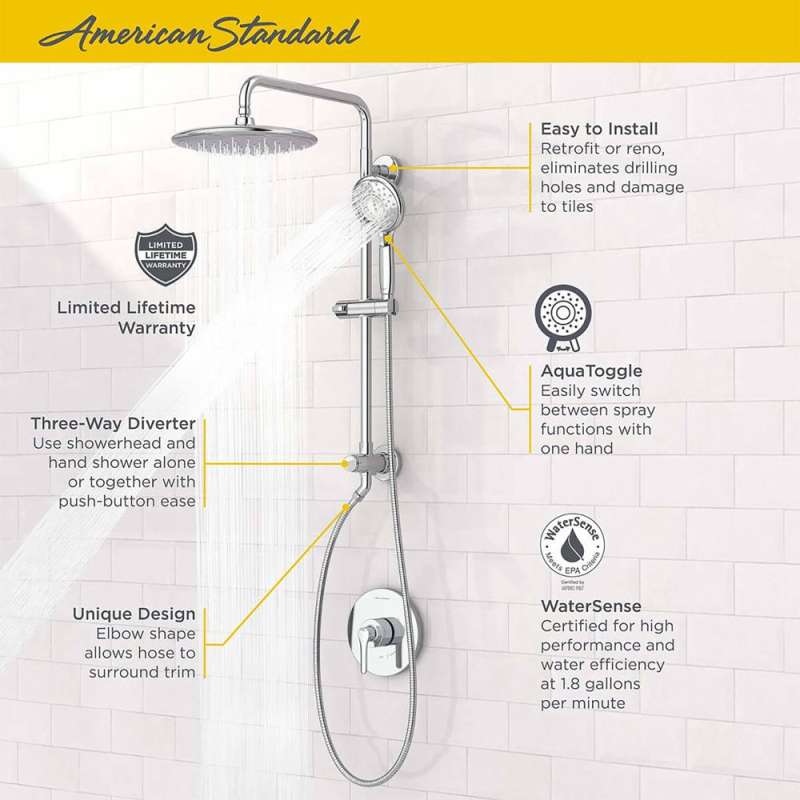 The 3-in-1 versatility of the Spectra Versa Shower System from American Standard allows everyone in the family to enjoy a truly personalized shower. Indulge in the drenching spray of the 11” Rain showerhead and the 4-function hand shower, individually or simultaneously, easily switching between both with the push-button diverter. Designed for hassle-free installation using existing plumbing, Spectra Versa eliminates the need to drill or damage tile, transforming an ordinary shower in an extraordinary spa experience in just 30 minutes.