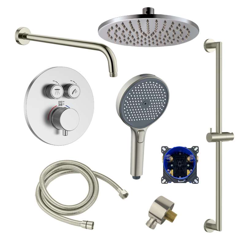 - Kit includes: (1) 12-in showerhead, (1) 16-in shower arm, (1) two function thermostatic valve and trim, (1) Forever Box, (1) 5-in hand shower, (1) 36-in sliding bar, (1) 59-in shower hose, and (1) wall elbow