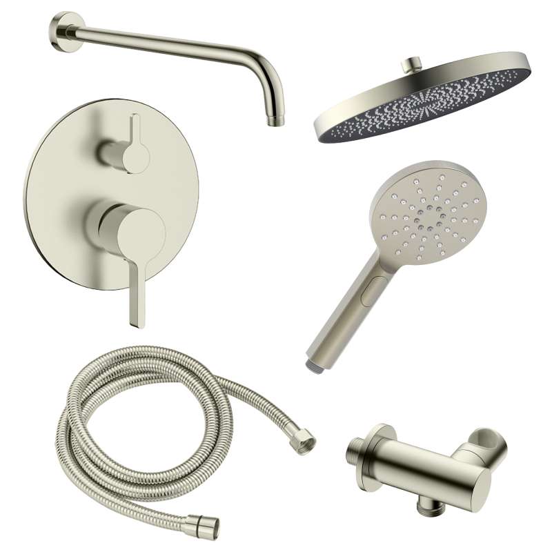 • Kit includes: (1) 9-in showerhead, (1) 12-in shower arm, (1) two function pressure balance valve and trim, (1) 5-in hand shower, (1) 59-in shower hose, and (1) wall elbow