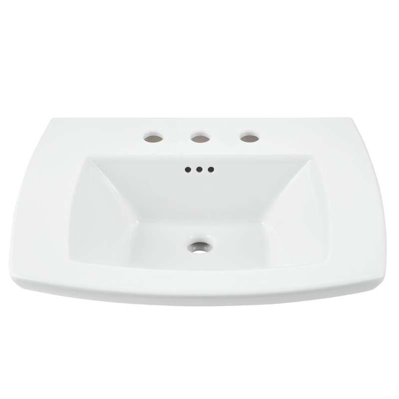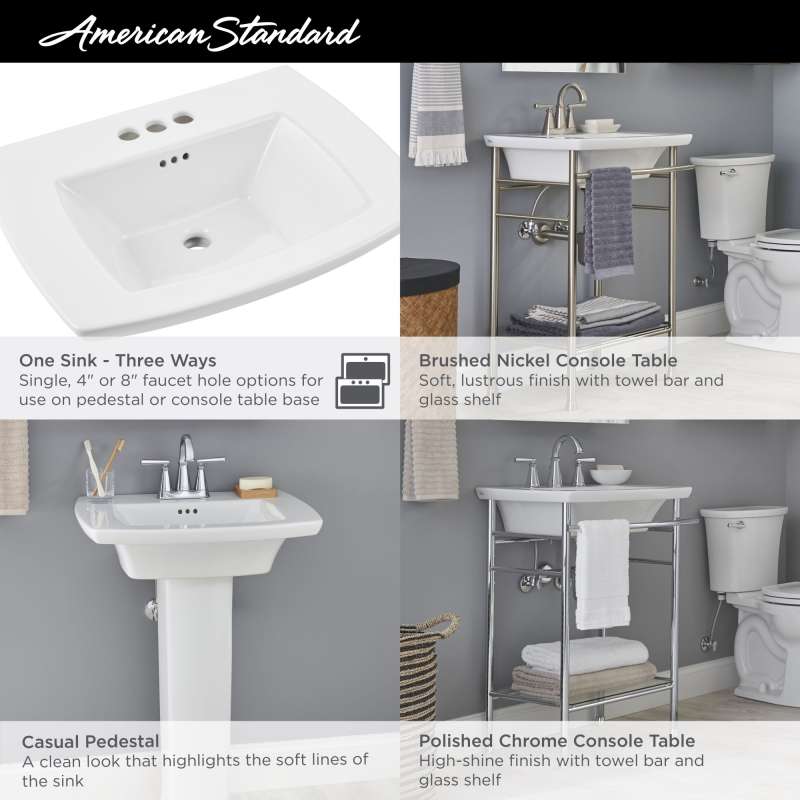 The Edgemere bathroom sink top from American Standard has 4-inch centers to pair with one of our beautiful bathroom faucets. This elegant sink top can be paired with the Edgemere pedestal sink leg or the console sink legs, providing you with a customized bathroom that fits your needs. This expertly crafted sink top installs easily on the Edgemere sink legs, and was designed to match a variety of bathroom styles.