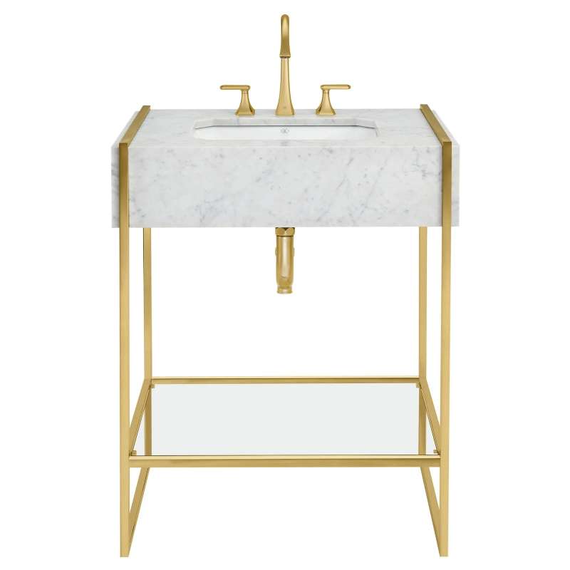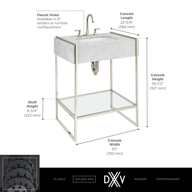 The Belshire Console Frame from DXV complements the Belshire Marble Console perfectly, lending support and a touch of Art Deco influence. Made of cast brass, with glass shelf providing welcome storage and adding to the open, airy feel of the design.
