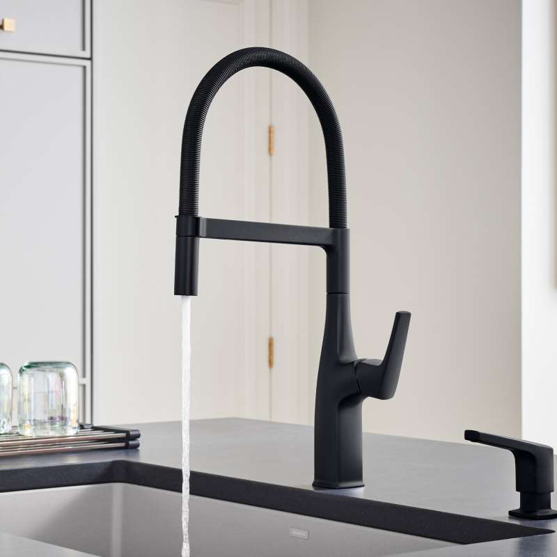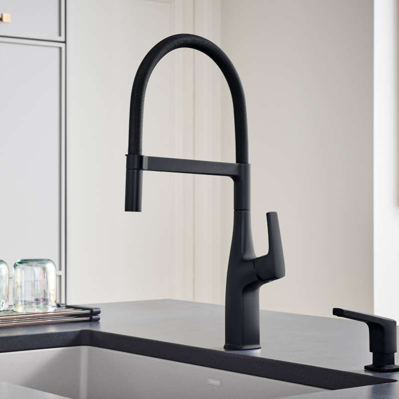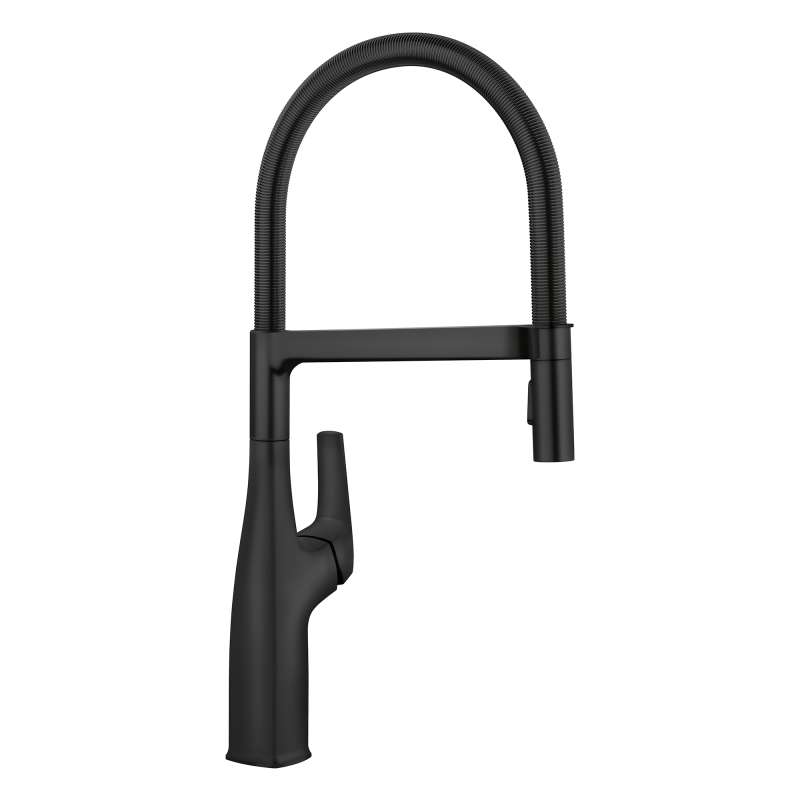 Where form and function unite. Inspired by faucets used in professional kitchens, BLANCO is the originator of the closed coil design and combines industrial style with modern appeal. The BLANCO RIVANA SEMI-PROFESSIONAL KITCHEN FAUCET delivers powerful performance with sleek design aesthetics. A clean, square design at the faucet base transitions into a rounded spout, blending organic shapes with ergonomic function. The BLANCO RIVANA provides home chefs with the ultimate in luxury and performance.