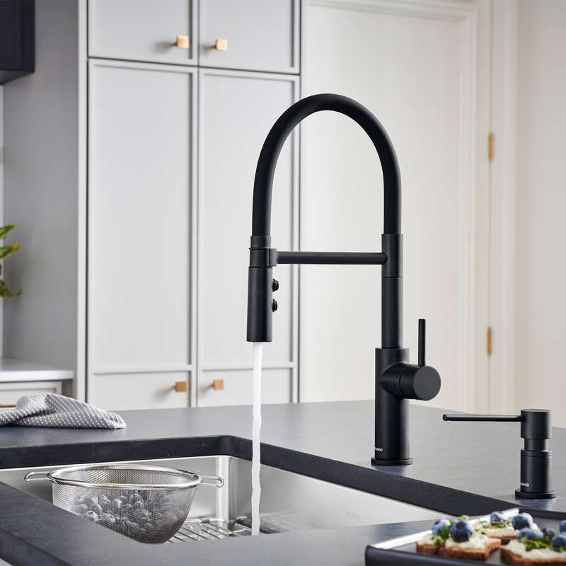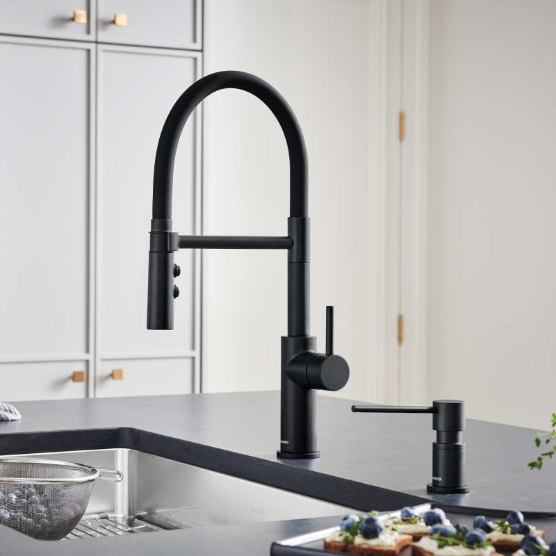 The CATRIS FLEXO offers a fresh take on the semi-professional faucet, combining functional elements and modern industrial flair. Designed to make cooking and cleaning more efficient than ever before, the CATRIS FLEXO boasts a 360-degree swivel for extended range of motion and a dual spray function to tackle everyday tasks from rinsing dishes to power washing dirty pots and pans. Its patented aerator significantly reduces limescale buildup, while its flexible, matte-black rubber hose provides a sleek, industrial look. The CATRIS FLEXO is built to deliver high performance for many years while providing long-lasting convenience. Easily pair your CATRIS FLEXO with your favorite BLANCO sink and accessories for a fully integrated BLANCO UNIT. With this setup, you'll have everything you need to drink, prep and clean all in one place.