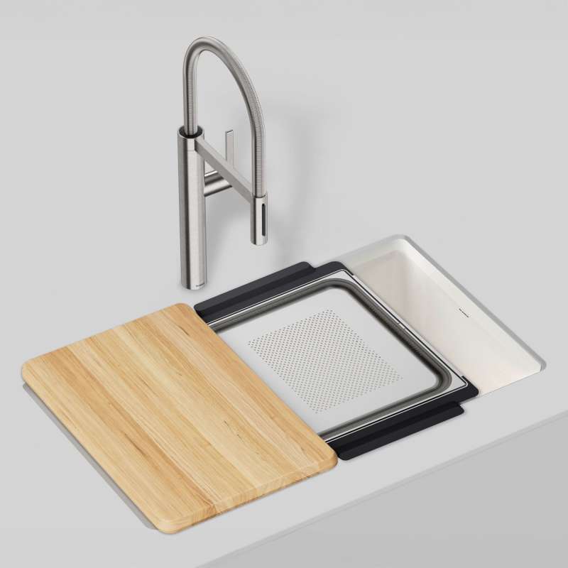 - Included INTEOS workstation sink accessories: Wood Cutting Board, Large Colander and Accessory Holder