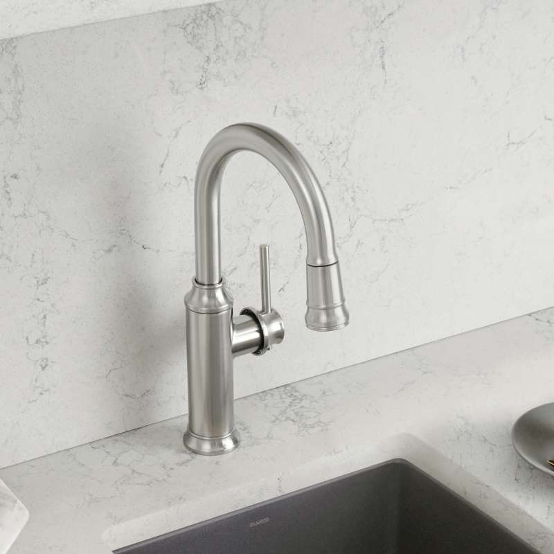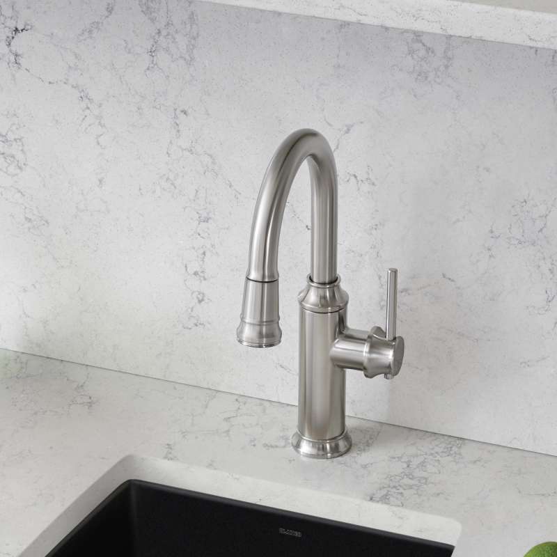 Two worlds collide with the EMPRESSA PULL-DOWN BAR FAUCET - modern features with traditional, old world detailing. Inspired by German wine country, the EMPRESSA BAR FAUCET is modeled after the shape of vintage wine presses found across Europe. Characterized by signature details such as vintage wine press-inspired handles and an integrated pull-down single-function spray, the EMPRESSA is the perfect example of classic European design infused with modern features and functionality. The EMPRESSA can be easily installed in kitchen islands, wet/dry bars, or smaller kitchens with less clearance space.