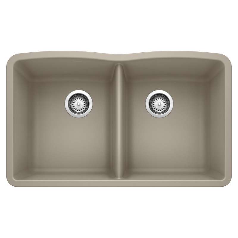 The BLANCO DIAMOND DOUBLE BOWL UNDERMOUNT KITCHEN SINK features a 5/5 bowl design, offering plenty of room for rinsing, washing, soaking, spraying and straining operations. The ideal choice for those who wash dishes by hand, you can stack dirty dishes and utensils in one sink while prepping in the other. This kitchen sink is made of SILGRANIT, a patented, certified granite composite material that is engineered to take on the toughest kitchen tasks. SILGRANIT is heat, scratch, stain, chip and impact resistant, making it stronger and more durable than other sink materials. Beautiful and highly functional with its non-porous, hygienic surface, it pushes away liquids and residue resulting in a low maintenance, easy to clean, long-lasting material. The DIAMOND double bowl kitchen sink easily conquers the demands of everyday life.
