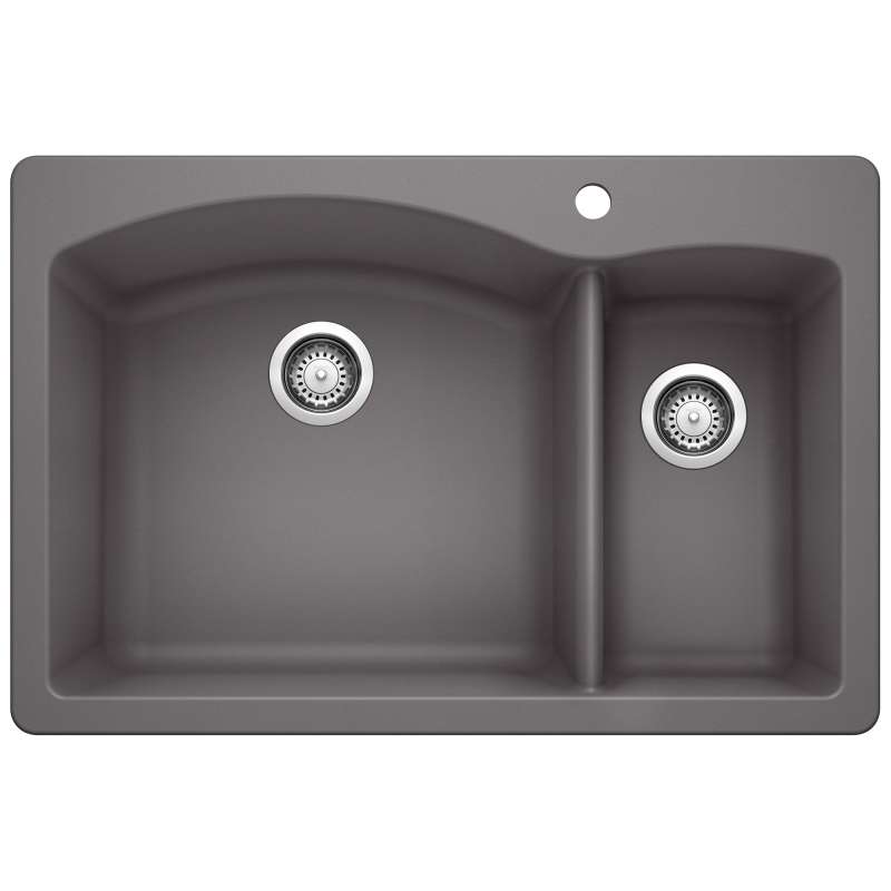 The BLANCO DIAMOND 70/30 DOUBLE BOWL DUAL MOUNT KITCHEN SINK features a 70/30 bowl design, offering plenty of room for rinsing, washing, soaking, spraying and straining operations. The 70/30 bowl split allows for washing larger items while still leaving the smaller bowl open. This kitchen sink is made of SILGRANIT, a patented, certified granite composite material that is engineered to take on the toughest kitchen tasks. SILGRANIT is heat, scratch, stain, chip and impact resistant, making it stronger and more durable than other sink materials. Beautiful and highly functional with its non-porous, hygienic surface, it pushes away liquids and residue resulting in a low maintenance, easy to clean, long-lasting material. The DIAMOND double bowl kitchen sink easily conquers the demands of everyday life.