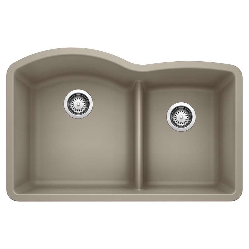 The BLANCO DIAMOND 60/40 DOUBLE BOWL UNDERMOUNT KITCHEN SINK with LOW DIVIDE features a 60/40 bowl design with low partition, offering plenty of room for rinsing, washing, soaking, spraying and straining operations. The 60/40 bowl split allows for washing larger items while still leaving the smaller bowl open. The ideal choice for those who wash dishes by hand, you can stack dirty dishes and utensils in one sink while prepping in the other. This kitchen sink is made of SILGRANIT, a patented, certified granite composite material that is engineered to take on the toughest kitchen tasks. SILGRANIT is heat, scratch, stain, chip and impact resistant, making it stronger and more durable than other sink materials. Beautiful and highly functional with its non-porous, hygienic surface, it pushes away liquids and residue resulting in a low maintenance, easy to clean, long-lasting material.