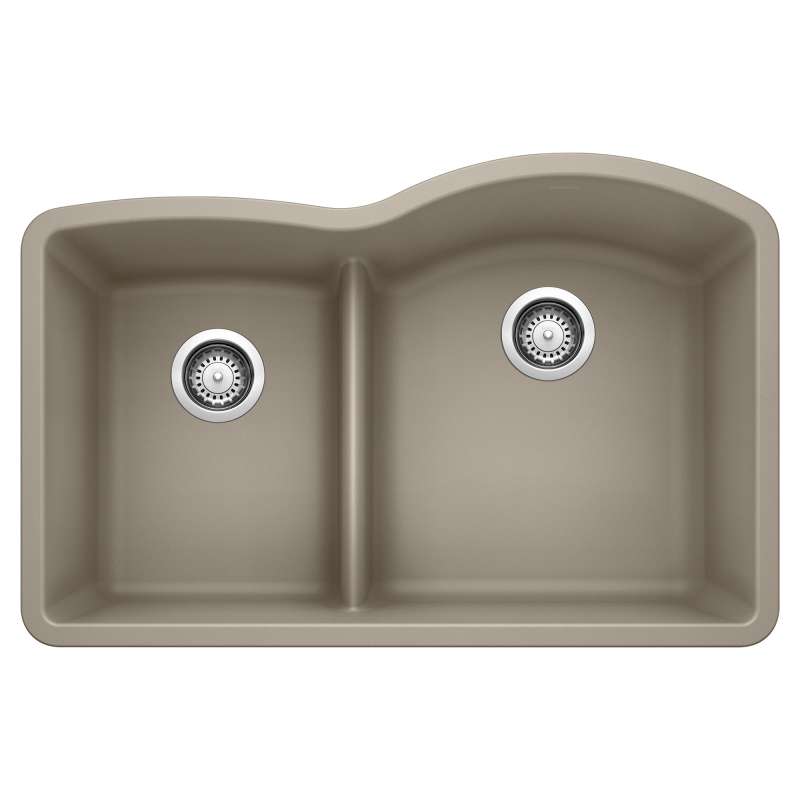 The BLANCO DIAMOND 4/6 REVERSE DOUBLE BOWL UNDERMOUNT KITCHEN SINK with LOW DIVIDE features a 4/6 bowl design, offering plenty of room for rinsing, washing, soaking, spraying and straining operations. The 4/6 bowl split allows for washing larger items while still leaving the smaller bowl open. This kitchen sink is made of SILGRANIT, a patented, certified granite composite material that is engineered to take on the toughest kitchen tasks. SILGRANIT is heat, scratch, stain, chip and impact resistant, making it stronger and more durable than other sink materials. Beautiful and highly functional with its non-porous, hygienic surface, it pushes away liquids and residue resulting in a low maintenance, easy to clean, long-lasting material.