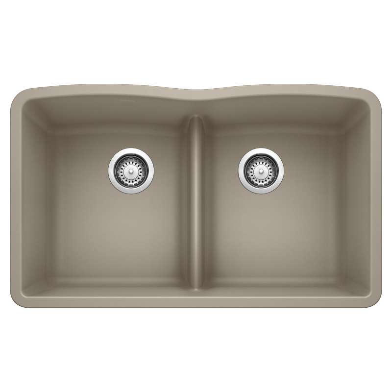 Single bowl space, double bowl convenience. The BLANCO DIAMOND DOUBLE BOWL UNDERMOUNT KITCHEN SINK with LOW DIVIDE features a 5/5 bowl design with low partition, offering plenty of room for rinsing, washing, soaking, spraying and straining operations. The ideal choice for those who wash dishes by hand, you can stack dirty dishes and utensils in one sink while prepping in the other. This kitchen sink is made of SILGRANIT, a patented, certified granite composite material that is engineered to take on the toughest kitchen tasks. SILGRANIT is heat, scratch, stain, chip and impact resistant, making it stronger and more durable than other sink materials. Beautiful and highly functional with its non-porous, hygienic surface, it pushes away liquids and residue resulting in a low maintenance, easy to clean, long-lasting material.