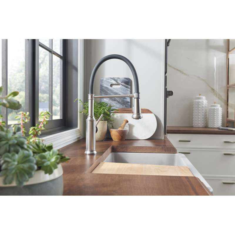 Two worlds collide with the EMPRESSA SEMI-PRO - modern, professional features with traditional, old world detailing. Inspired by our German heritage, the EMPRESSA Semi-Pro Single-Handle Pull-Down Sprayer Kitchen Faucet is modeled after the shape of vintage wine presses found across Europe. An iconic addition to the Blanco faucet family, the Empressa Semi-Pro Kitchen Faucet features a high arc and is expertly crafted to seamlessly blend traditional elements with contemporary lines. The cylindrical support arm includes an easy to use magnetic handspray holder. The chef-inspired matte-black rubber hose offers added flexibility and reaches all corners of the sink. The elegant and tastefully ornate EMPRESSA SEMI-PRO pairs beautifully with modern farmhouse sink styles.