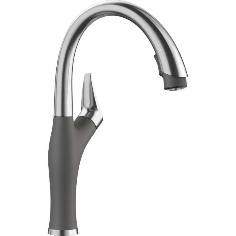 - Color matched faucet features solid brass body, dual pull-down spray, ceramic disc cartridge, with 1.5 GPM flow rate