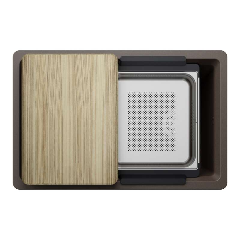 - Included INTEOS workstation sink accessories: Wood Cutting Board, Large Colander and Accessory Holder