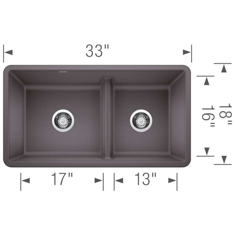 The PRECIS 33" 60/40 REVERSIBLE DOUBLE BOWL UNDERMOUNT KITCHEN SINK with LOW DIVIDE offers clean lines and a spacious dual bowl design. The sink's reversible design also makes any kitchen sink specification easy to achieve. Made of SILGRANIT(R), PRECIS kitchen sinks are engineered to withstand heavy cookware and hot bakeware. Silgranit sinks are not only strong but also beautiful, available in a range of nature-inspired colors that effortlessly complement the latest kitchen trends. Combine the PRECIS sink with a BLANCO faucet and accessories to create a BLANCO UNIT; a seamlessly integrated kitchen solution designed to transform kitchen chores into joyful experiences. Everything you need to drink, prep and clean, all in one place.
